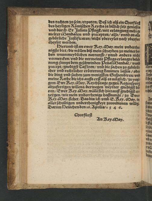 nigste bitt/ die wollen diß mein schreyben zu meiner ho ³ hen vnuormeydlichen notturfft/ vnnd anders nicht vormercken/ vnd die vermeinte Pflugs erlangte beleh nung/ sampt dem geschwinden Penal Mandat/ vnnd ee vnd die sachen zu gebürli⸗ cher vnd rechtlicher erörterung kommen 1 oder die ding vnd sachen zum wenigsten Suspendiren/ vnd meine Rethe die ichs** erstalß es muglich/ zu yetzi⸗ gem E wr Rey. May. Reychßtage gegen A ednne abzufertigen willens/ derwegen weytter gnedigst ha ren/ Ewer Rey. May. wölle sich hierauff gnedigst er⸗ zeygen/ wie mein vnderthenige hoffnunge/ zu Ewer Key. May. stehet/ Das bin ich vmb E. Rey. May. in