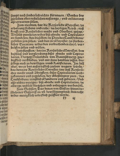 ve gütlichen oder rechtlichen außtrags/ vnd erörterung adap also er warten sollen. el, Jum vierdten/ hat die Reyserliche Mayestat/ zu öde er haltung fridens vnd ruhe/ im heyligen Reych/ auß bonn kr afft jrer Keyserlicher macht vnd Oberkeyt/ gesetzt/ Wo solch partheien wider dise abrede vnd Capitulati⸗ chan on handelen/ das dieselben/ in Peen des Landfridens/ 0 gefallen sein sollen/ vnd das jre Mayestet/ zu fürder⸗ b licher Execution/ wider den verbrechenden theyl/ ver⸗ hbelffen sollen vnd wöllen. Zum fünfften/ das jre Keyserliche Mayestat/ den 0 beschluß vnd vergleychung diser abrede vnd Capitu⸗ lation/ Hertzog Heinrichen von Braunschweyg/ gne⸗ digklich verkünden/ vnd mit ihme handlen lassen/ die⸗ selbige auch zu bewilligen vnnd Ratificieren. Im fall u aber/ wo er das außtrücklich zuthun wegern würde/ das dennfre Reyserliche Mayestet! jme auß Keyserli⸗ la cher macht vnnd Obrigkeyt/ diser Capitulation nach⸗ wit pu zukommen vnd zugeleben/ bey obbestimpter peen/ des ice Dandfridens/ ernstlich Mandiern vnd gebieten/ Vnd 7.5 also nichts weniger/ dise abrede vnd Capitulation /in h allwege/ endlich 1 vnd volnzogen werdensoll. be Zum Sechsten/ Das denen von Goßlar/ hieuor be⸗ don schehener Suspensston vñ bewilligungnach/ das recht ht nu wider menigklich würcklich geöffnet werde. A kechlt ii gil hey/ rd