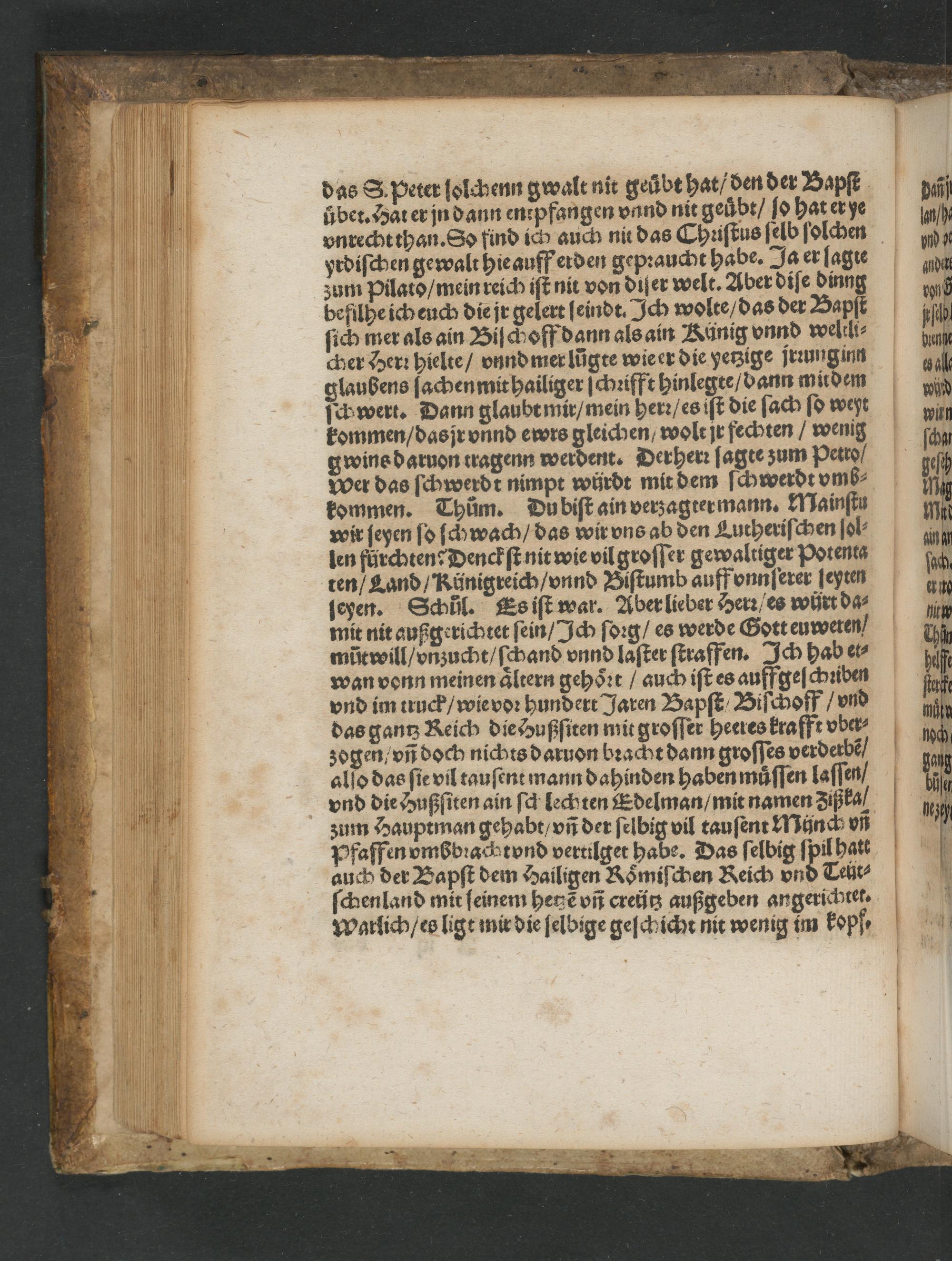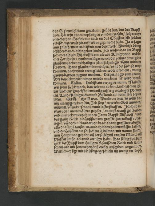 das S. peter solchenn gwalt nit geübt hat/ den der Bapst ůbet. Hat er jn dann enẽpfangen vnnd nit geübt/ so hat er ze vnrecht than. So sind ich auch nit das Christus selb solchen yrdischen gewalt hie auff erden gepraucht habe. Ja er sagte zum pilats/ mein reich ist nit von diser welt. Aber dise dinng befilhe ich euch die jr gelert seindt. Ich wolte/ das der Bapft sich mer als ain Bil choff dann als ain Künig vnnd weltli⸗ cher Her: hielte/ vnnd mer lůgte wie er die yetzige srrung inn glaubens sachen mit hailiger schrifft hinlegte/ dann muidem schwert. Dann glaubt mir/ mein herr/ es ist die sach so weßt kommen/ das jr vnnd ewrs gleichen/ wolt jr fechten/ wenig gwins darunon tragenn werdent. Derherr sagte zum Petro/ Wer das schwerdt nimpt wůrdt mit dem schwerdt vmb⸗ kommen. Thům. Du bist ain verzagter mann. Mainstu wir seyen so schwach/ das wir vns ab den Lutherischen sol⸗ len fürchten? Denckst nit wie vil grosser gewaltiger Potenta ten/ Land/ Rünigreich/ vnnd Bistumb auff vnnserer seyten leyen. Schul. Es ist war. Aber lieber Herz es wůrt da⸗ mit nit außgerichtet sein/ Ich sorg/ es werde Gott euweten/ mũtwoill/ vnzucht/ schand vnnd laster straffen. Ich hab et⸗ wan vonn meinen ältern gehört/ auch ist es auffgelchuiben vnd im truck/ wie vdr hundert Jaren Bapst Bischoff/ vnd das gantz Reich die hußsiten mit grosser heeres krafft vber⸗ zogen/ vñ doch nichts daruon bracht dann grosses verderbẽ/ also das sie vil tausent mann dahinden haben můͤssen lassen/