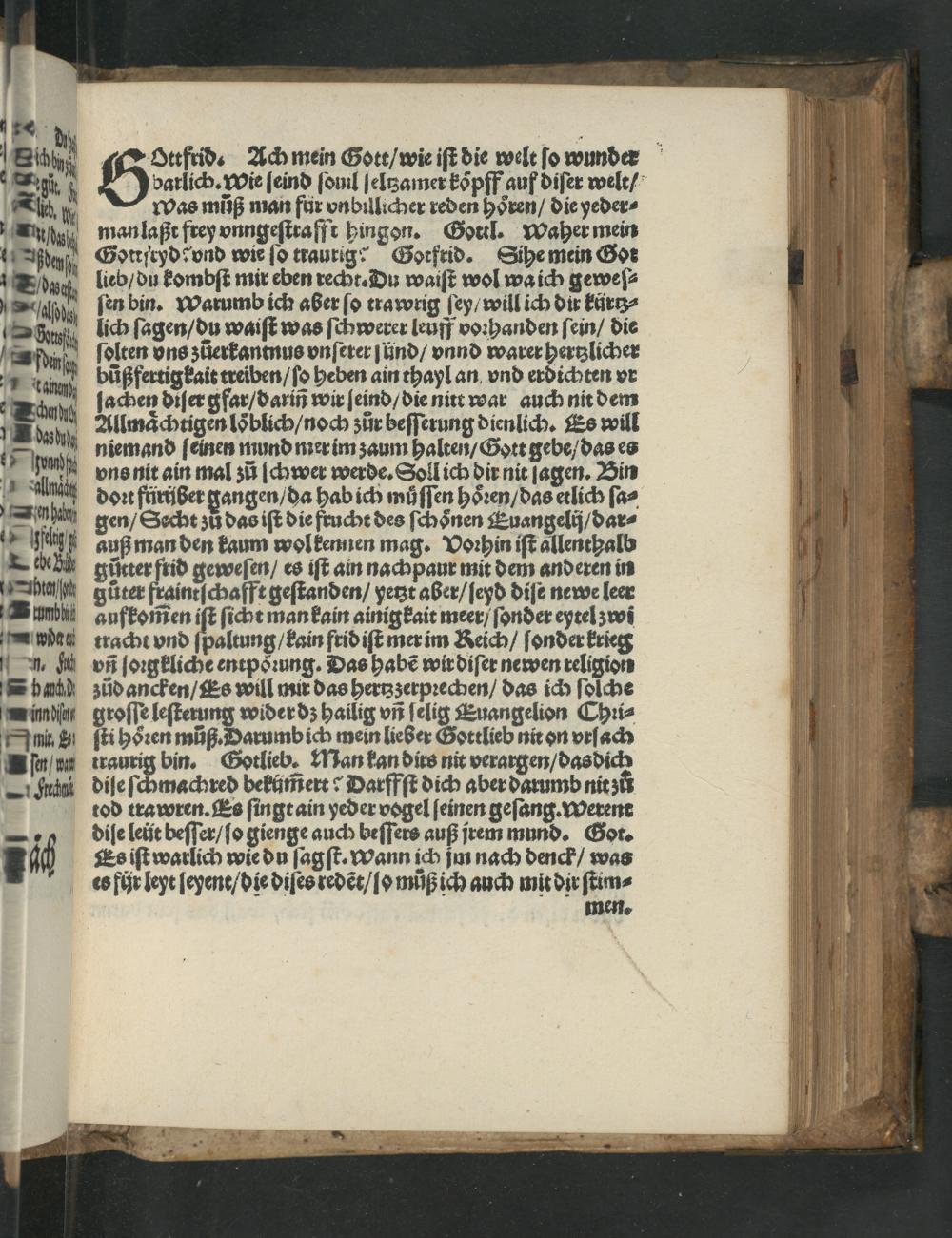 zũůdancken/ Es will mir das hertz zerprechen/ das ich solche u grosse lesterung wider dz hailig vñ selig Euangelion Chri⸗ sti hören mũß. Darumb ich mein lieber Gottlieb nit on vrsach traurig bin. Gotlieb. Man kan dirs nit verargen/ das dich