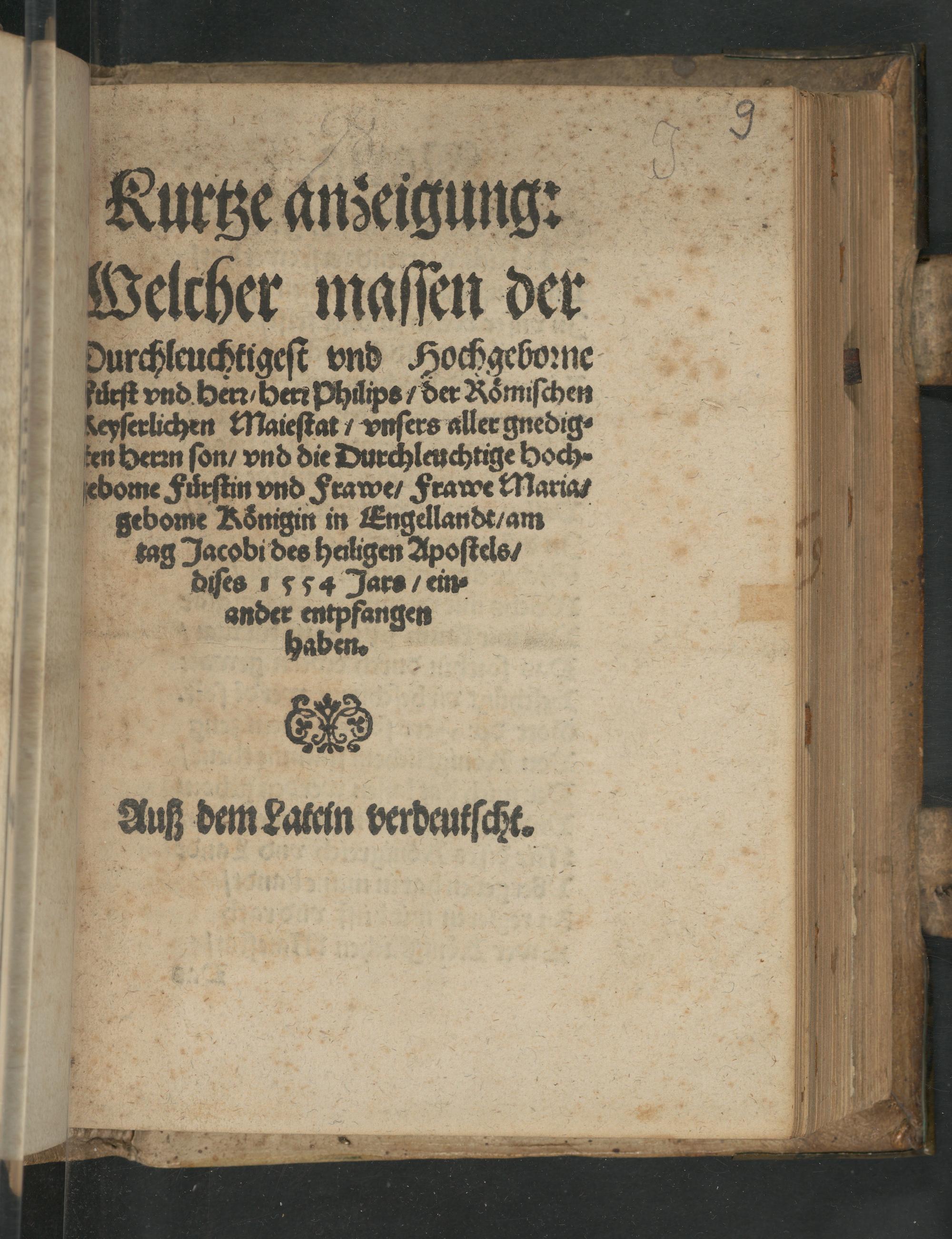 Kurtze anzeigung: Welcher massen ... Herr Philips, der Römischen Keyserlichen Maiestat ... son, und ... Frawe Maria, geborne Königin in Engellandt, am tag Jacobi des heiligen Apostels, dises 1554 Jars, einander entpfangen haben. Aus dem Latein verdeutscht