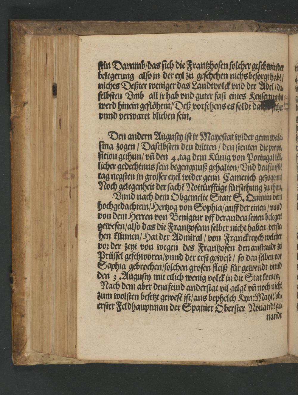 vnnd verwarct blieben sein. Den andern Augusty ist ir Mayestat wider genn wal ina zogen/ Daselbsten den dutten/ den stenten die pep, tion gethun/ vñ den 4 tag dem Künig von Portugal licher gedechtnus sein begengnuß gehalten/ Und denn kag negsten jn grosser eyel wider genn Camerich gezogen Noch gelegenheit der sache Nottürfftige fürstehung zu hn. Dnnd nach dem Obgemelte Statt S. Quintin oy hochgedachtem/ Hertzog von Sophia/ auff der einen/ vnn von dem Herren von Benigtur vff deranden saten begean gewesen/ also das die Frantzosenn selber nicht haben ver hen künnen/ Hat der Admiral/ von Franckieych weschn vor der zeyt von wegen des Frantzosen den anstandt Prüssel geschworen/ onnd der erst gesvest/ so den selbenun