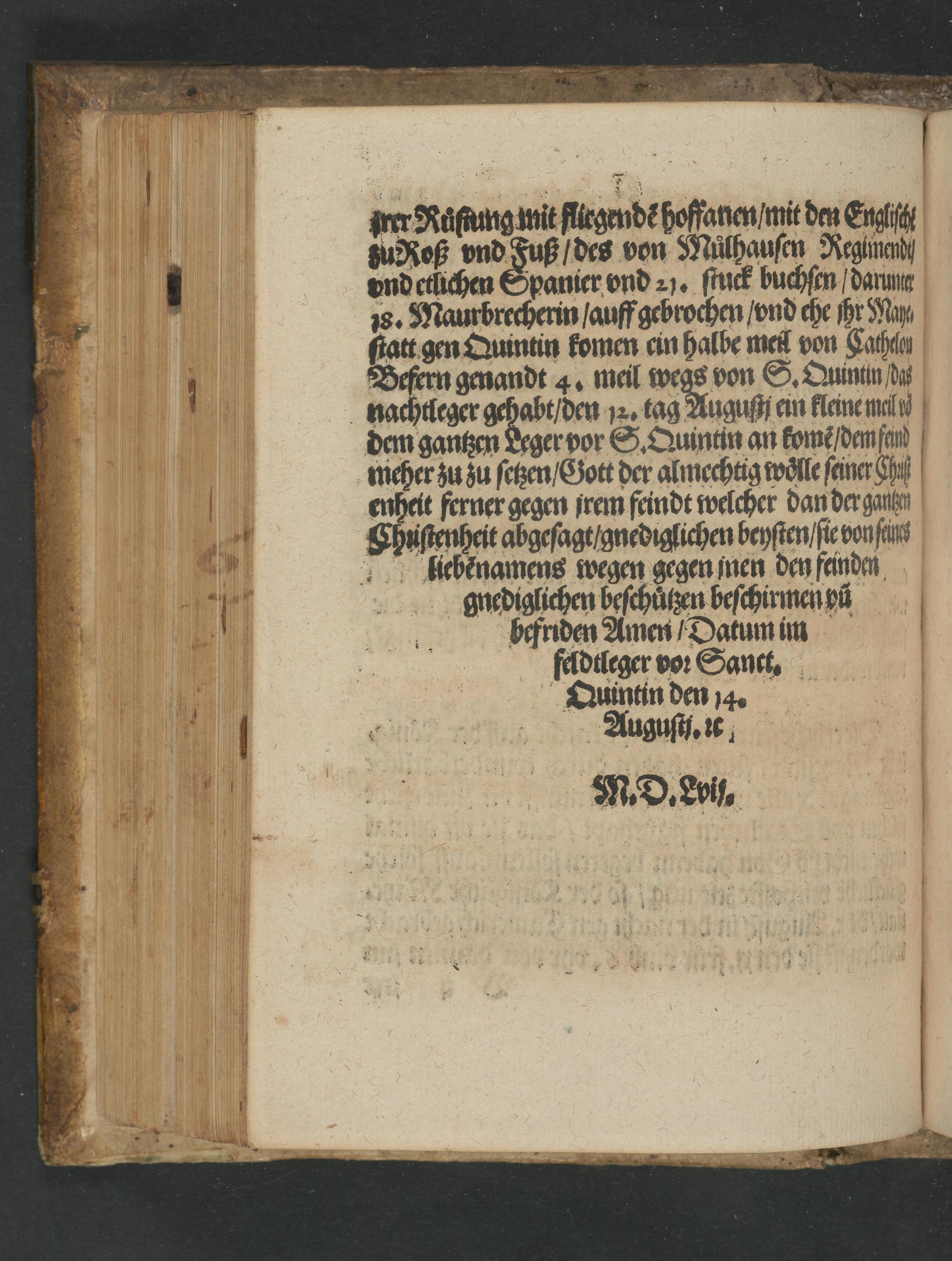 dem gantzen Leger vor S. Quintin an kome dem ad 1 meher zu zu setzen/ Gott der almechtig wölle seiner dh 14 enheit ferner gegen jrem feindt welcher dan der gange 1 Chustenheit abgesagt/ gnediglichen beysten siebonsant 10 lliebenamens wegen gegen nen den feinden 5 141K pghnediglichen beschüͤtzen beschirmen ů D befriden Amen/ Datum im „ 3 feldtleger vo Sant. N N Quintin den 4.