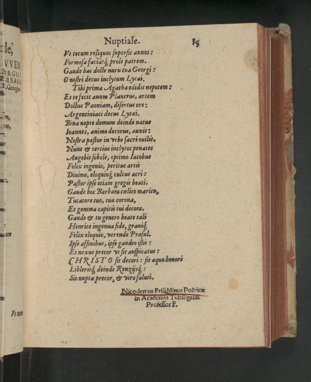 For mosa faciatꝶj prole patrem. Gaude has dolle nuru tua Georgi: O nostri decus inclytum Leytæi. Tibi prima Agatha edidit nepotem Et te fecit auum Planerus, artem Doctus Pæoniam, disertus ore: Argentiniaci decus Lycæi. Zina nepte domum deinde natus Joannes, animo decorus, auxit: Nuostra pastor in vrbe sacri ouilis. Nune E tertius inclytos penates Augebit sobole, optimo Jacobus Felix ingenio, peritus artis Diuinæ, eloquioss cultus acri: Paslor ipse etiam gregis beati. Caude hoc Barbam cælico marito, Tutatore tuo, tua corona, Et gemma capitis tui decora. Caude& tu genero beate tali HFenrice ingenua ide, grauisj Felix eloquio, verende Prasul. Ipse affenibus 5 ipse gaudeo Vis: Et nexus precor vt sit auspicatus: CHRIST o sit decori: sit æquo honori Libleruq deinde Renxijh: Sit nußtæ recor,& viro saluti.