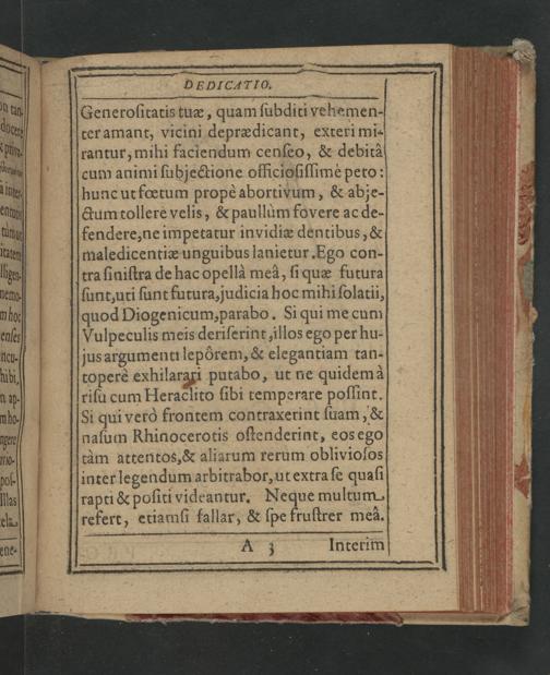 hunc ut fœtum propè abortivum,& abje- cum tollere velis,& paullùm fovere ac de- fendere, ne impetatur invidiæ dentibus,& maledicentiæ unguibus lanietur. Ego con- tra sinistra de hac opellà mea, si quæ futura sunt, uti sunt futura, judicia hoc mihi solatii, quod Diogenicum, parabo. Si qui me cum Vulpeculis meis deriserint illos ego per hu- jus argumenti lepõrem,& elegantiam tan- toperè exhilargri putabo, ut ne quidemaà risu cum Heraclito sibi temperare possint. Si qui verò frontem contraxerint suam,&
