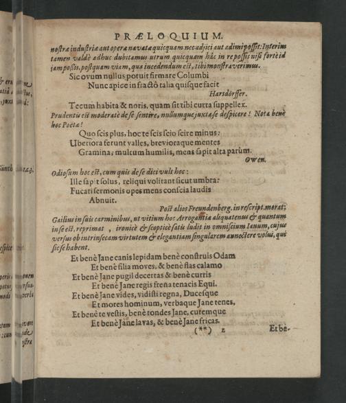 Quo seis plus, hot te seis seio seire minus: Uberlora ferunt valles, brevioraque mentes Gramina,; multum humilis, mens sapit alta parum. e Odiosum hoc eit, cum quis de se diti vult ht 5 Ille sapit solus, reliqui volitant sicut umbra: Fucati sermonis opes mens conscia laudis Abnuit. i 8 8 8 . 8 Pio alios Freundenberg. in rseript.morat: Cailius in suis carminibus, ut witium hos Arrogantiæ aliquatenus& guantum in se elt, reprimat, ironice& scopticè satis ludit in omniscium Ianum, cujus versus ob intrinsecam virtutem& eligantiam singularem aunectere uolui, Jui sic se habent. 8 11 1 Et benè jane canis lepidam benè construis Odam Et benè filia moves,& benè flas calamo Et benè jane pugil decertas& benè curris Et benè jane regis frena tenacis Equi. Et bens jane vides, vidisti regna, Ducesque Et mores hominum, verbaque Jane tenes, Et beneè te vestis, benè tondes Jane, cutemque Et benè jane lavas,& benè jane fricas. „„