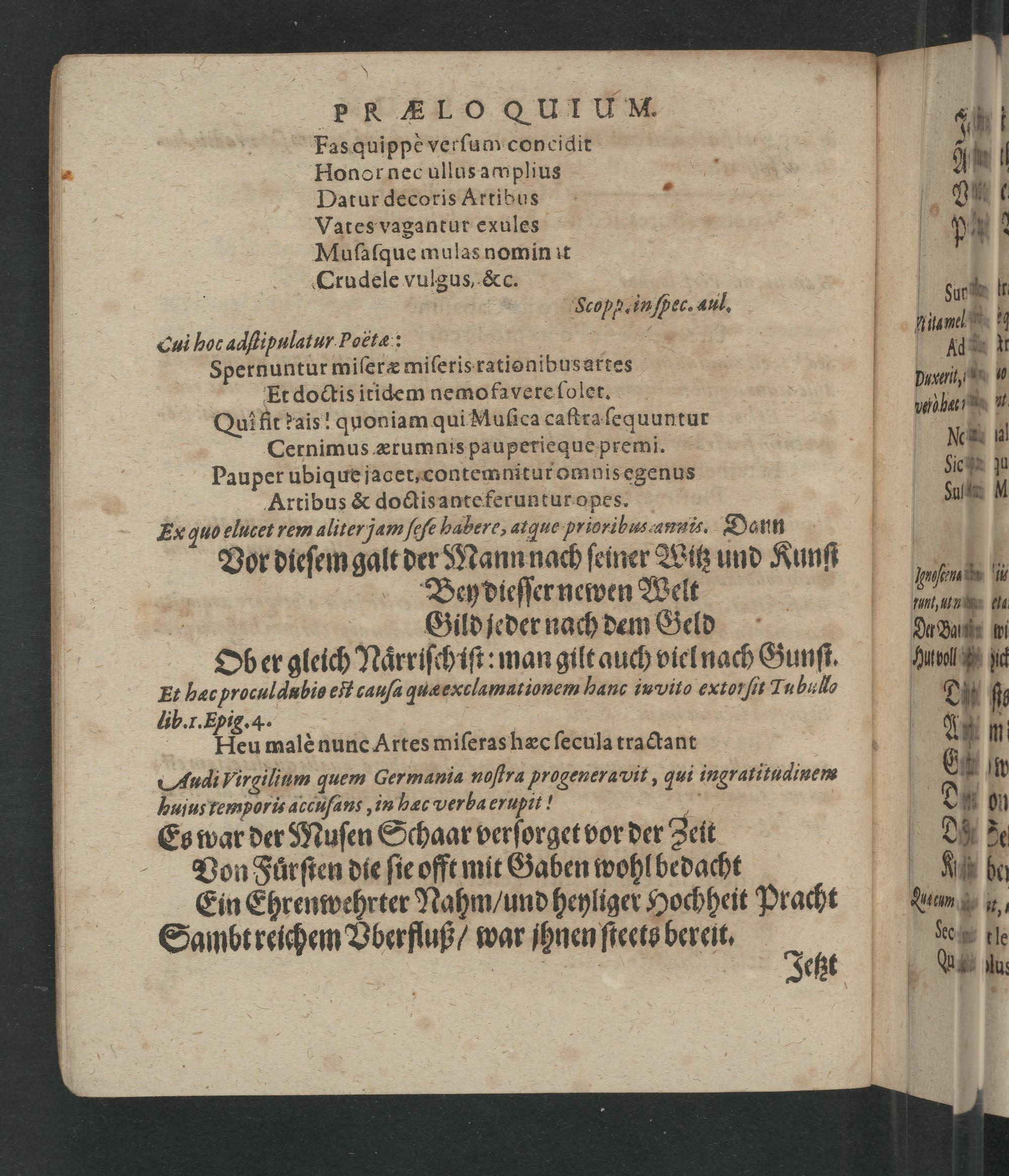 Spernuntur miseræ miseris rationibus artes e Et doctis itidem nemofavere solet. Quꝭ fit dais! quoniam qui Musica castra sequuntur Cernimus ærumnis pauperieque premi. Pauper ubique jacet, contemmitut omnisegenus 8 Artibus& doctis ante ferunturopes. Ex quo elucet rem aliter jam ses habere, alque priori bus amnis. Dann Vor diesem galt der Mann nach seiner Witz und Kunst 4 Ben diesser newen Welt Eild jeder nach dem Geld Ober gleich Närrischist: man gilt auch viel nach Gunst. Et hac proculdabis eit causa quæexclamuationem hanc iuvito extossit Tu bullo . 8 IJifeu malè nunc Artes miseras hæc secula tractant Audi Virgilium quem Germania nostra progeneravit, qui ingratitudinem hujus temporis accissans, in hæc verba erupit! 8