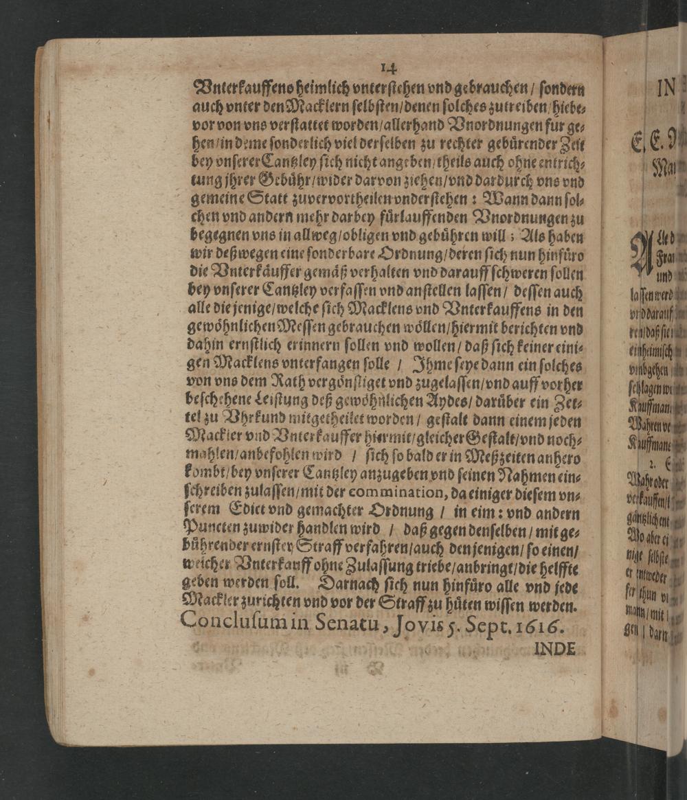 gewöhnlichen Messen gebrauchen wöllen/ hiermit berichten vnd dahin ernstlich erinnern sollen vnd wollen/ daß sich keiner eini⸗ gen Macklens vnterfangen solle/ Ihme seye dann ein solches von vns dem Rath vergönstiget vnd zugelassen/ vnd auff vorher beschehene Leistung deß gewohnlichen Aydes/ darüber ein Zet⸗ tel zu Vhrkund mitgetheilet worden/ gestalt dann einem jeden Mackier vnd Vnterkauffer hir mit/ gleicher Gestalt/ vnd noch⸗ mahlen/ anbefohlen wird/ sich so bald er in Meß zeiten anhero kombt/ bey vnserer Cantzley anzugeben vnd seinen Nahmen ein⸗ schreiben zulassen/ mit der com mination, da einiger diesem vn⸗ serem Edict vnd gemachter Ordnung/ in eim: vnd andern Puncten zuwider handlen wird/ daß gegen denselben/ mit ge⸗ bührender ernstey Straff verfahren/ auch den jenigen/ so einen/ weicher Vnterkauff ohne Zulassung triebe/ anbringt/ die helffte geben werden soll. Darnach sich nun hinfüro alle vnd jede Mackler zurichten vnd vor der Straff zu hüten wissen werden. Conclusum in Senatu, Jovis 5. Sept. 1616. 5 175 03 1 INDE