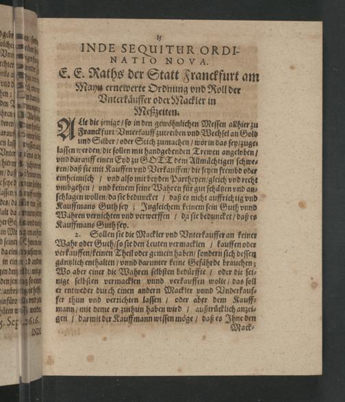 1 N ATIO NOVA. E. E. Raths der Statt Franckfurt am Mahn ernewerte Ordnung vnd Roll der Dnterkäuffer oder Mackler in