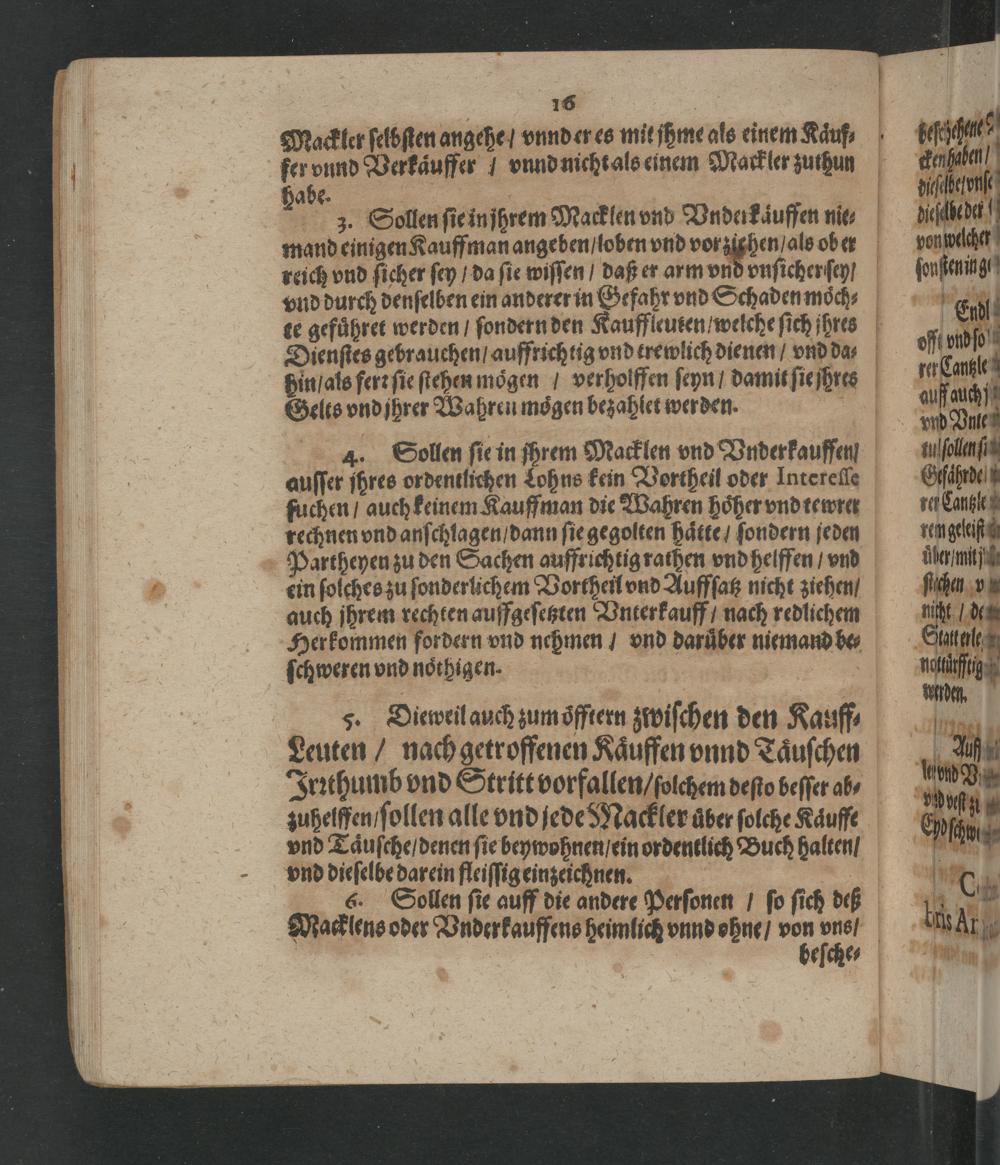 4. Sollen sie in shrem Macklen vnd Vnderkauffen ausser ihres ordentlichen Lohns kein Vortheil oder Interesse fuchen/ auch keinem Kauffman die Wahren höher vnd tewrer rechnen vnd anschlagen/ dann sie gegolten häite/ sondern seden