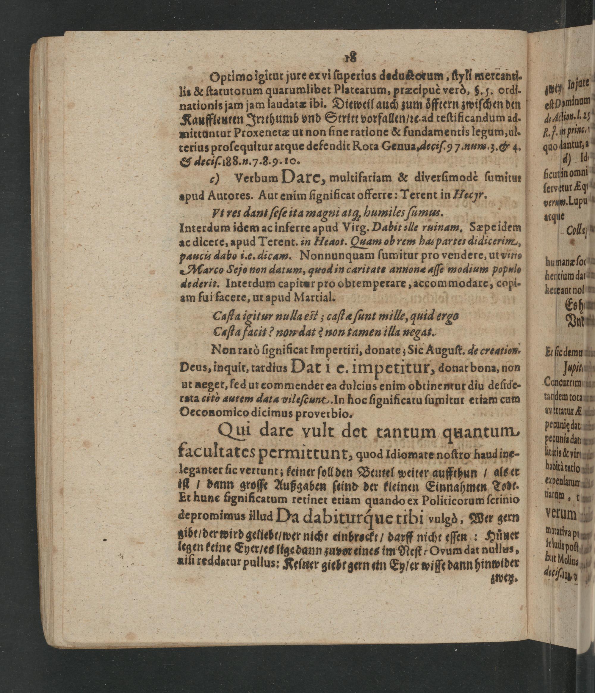 — 18 Optimo ĩgitur jure ex vi superlus dedustotum, styli mereanti. lis& statutorum quarumlibet Platearum, præcipuè verò, 5. 5. ordl. nationis jam jam laudatæ ibi. Ditweil auch zum öfftern zwischen den Kauffleuten Irrthumb vnd Stritt vorfallen/ ic. ad testificandum ad. mittuntur Proxenetæ ui non fine ratione& fundamentis legum, ul. terius prosequitur atque defendit Rota Genua, decis o 7. num. 3.& 4. & decisei8 8. n. 7. 8.9. 10. 4 c) verbum Dare, multifatiam& diversimodè sumitut apud Autotes. Aut enim significat offerre: Terent in Hechr. Pt res dani sese ita magui at humiles sumus. Interdum idem ac inferte apud Virg. Dabit ille ruinam. Sæpe idem ac dicere, apud Tetent. in Heaot. Quam ob rem has partes didicerim, auc is dabo i.e. dicam. Nonnunquam sumitur pro vendere, ut vino arco Sejo non datum, quod in caritate annonæ asse modium populo dederit. Inte rdum capitar pro obtemperare, accommodare, copi- am sui facete, ut apud Martial. Casfa igitur nulla elt; castæ sunt mille, quid ergo Casta facit? nom dat? non tamen illa negai. Non rarò significat Impertiri, donate; Sic August. de creation. Deus, inquit, tardius Dat i e. impetitur, donat bona, non ut neget, fed ut eommendet ea dulcius enim obtinemtut diu deside-