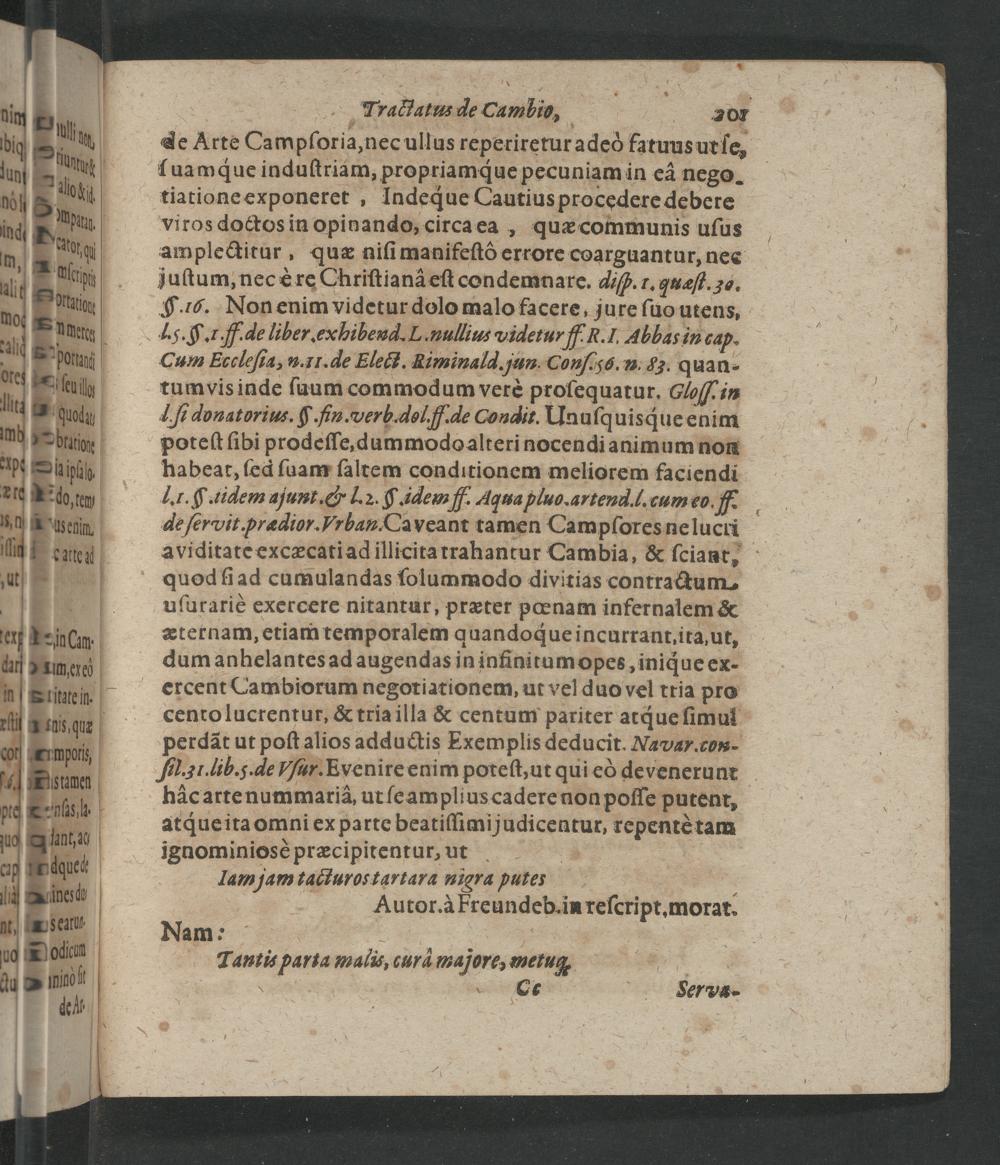 Dyadlatus de Cumbio, 2Jor de Arte Campsoria, nec ullus reperiretur adeò fatuus ut se, suamque industriam, propriamꝗque pecuniam in ca nego. tiatione exponeret, Indeqͥue Cautius procedere debere viros doctos in opinando, circa ea, quæ communis usus amplectitur, quæ nisi manifestò errore coarguantur, nec justum, nec è re Christiana est condemnare. disb. t. quæst. 30. H. io. Non enim videtur dolo malo facere, jure suo utens, 45. N. r. ide liber. exhibend. L. nullius videtur ff. R. I. Abbas in cap. Cum EHcclesia, u. it. de Elect. Riminald. jun Cons. go. u. H. quan- tumvis inde suum commodum verè prosequatur. GV in i donatorius.. fin. verb. dol ide Condit. Unusquisque enim potest sibi prodesse, dummodo alteri nocendi animum non habeat, sed suam saltem conditionem meliorem faciendi . Q idem ajunt.& l. 2. ¶. idem ff. Aqua pluo artend l. cum eb. F de servit. prædior. Vrban. Ca veant tamen Campsores ne lucri aviditate excæcati ad illicita trahantur Cambia,& sciant, quod si ad cumulandas solummodo divitias contractum. usutariè exercere nitantur, præter pœnam infernalem& æternam, etiam temporalem quandoque incurrant, ita, ut, dum anhelantes ad augendas in infinitumopes, iniqͥue ex- ercent Cambiorum negotiationem, ut vel duo vel tria pro