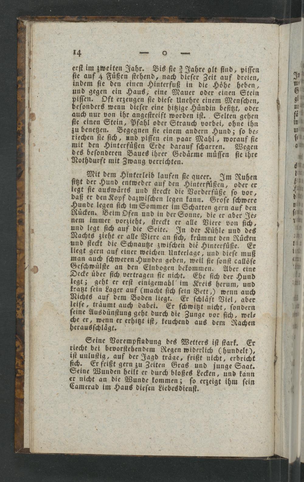 legt ſie auswaͤrts und ſtreckt die Vorderfuͤße ſo vor, daß er den Kopf dazwiſchen legen kann. Groſe ſchwere Hunde legen ſich im Sommer im Schatten gern auf den Ruͤcken. Beim Ofen und in der Sonne, die er aber Je⸗ nem immer vorzieht, ſtreckt er alle Viere von ſich, und legt ſich auf die Seite. In der Kuͤhle und des Nachts zieht er alle Viere an ſich, kruͤmmt den Ruͤcken und ſteckt die Schnautze zwiſchen die Hinterfuͤße. Er liegt gern auf einer weichen Unterlage, und dieſe muß man auch ſchweren Hunden geben, weil ſie ſonſt calloͤſe Geſchwuͤlſte an den Elnbogen bekommen. Aber eine Decke uͤber ſich vertragen ſie nicht. Ehe ſich der Hund legt; geht er erſt einigemahl im Kreis herum, und kratzt ſein Lager auf(macht ſich ſein Bett,) wenn auch Nichts auf dem Boden liegt. Er ſchlaͤft Viel, aber leiſe, träumt auch dabei. Er ſchwitzt nicht, ſondern ſeine Ausdunſtung geht durch die Zunge vor ſich, wel⸗ che er, wenn er erhitzt iſt, keuchend aus dem Rachen herausſchlaͤgt.