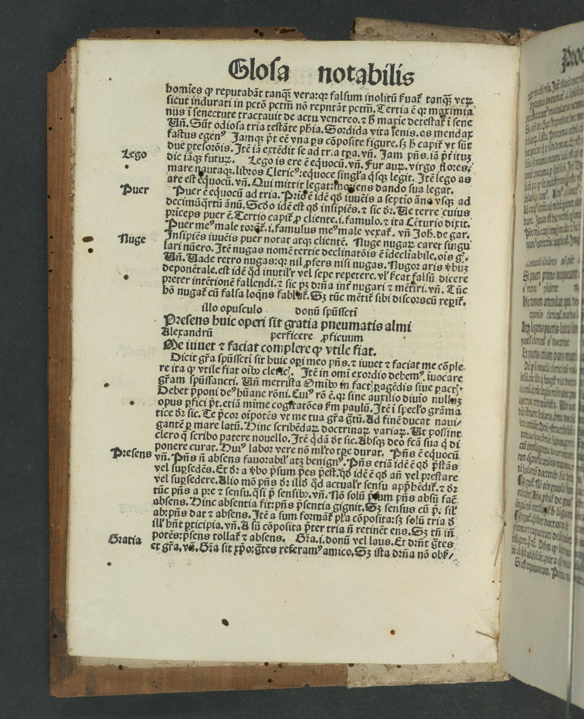 clero ꝗᷓ̃ ſcribo patere nouello. Itẽ q dã t ſic. Abſq; deò fs ſua qdi ponere curat. Huiꝰ laboꝛ vere nõ mlto eer durar. Pfs ẽequocũ vñ. Pñs ſů abſens fauoꝛabił atʒ benign Pñs etiã ideẽ að pſtãs vel ſupſedẽs. Et ðꝛ a vᷣbo p̃ſum pes peſt. ijd dẽ ẽq añ vel pꝛeſtare vel ſupſedere.Alio mõ pñs ðꝛ illð qͥꝗ actuałr ſenſu app bẽdit.⁊ 52 tũc pns a pꝛe ⁊ ſenſu.qᷓſi pᷣ ſenſib. vñ. Tlo ſolũ paum ins abſ ũ faẽ abſens. Hinc abſentia fit:pñs plenria gignit. Sz ſenſus cu p. ſil ab'Ds dat z abſens. Itéa ſum foꝛmar pla copoſita:tʒ ſolu rfi 8 ilſ hñt pricipia.vñ.Aå ſũ cõpoſita pᷣter tria ñ retinẽt ens.Sʒ tñ iñ porẽs:pᷣſens tollatĩ 7 abſens. Gꝛa.i.donũ vel laus.Et dꝛñt Sgtes et gfa va. Sda ſit xpo:gtes reteram amico. Sz ilta dꝛna no o0s⸗