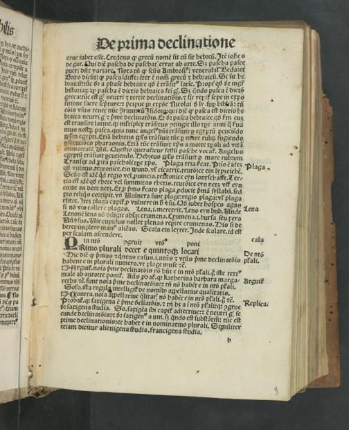 3.8 De pꝛima declinatione erne iubet eſſe. Cregens ꝙ grecũ nomẽ ſit cũ ſit hebꝛei„te lohee de gar. Qui diẽ paſcha de paſchat errat ab arte. S 3 aſepa haſce pueri dñt variare. Tlotatñ ꝙ ſcũs Aibꝛoſiꝰ: venerabi Sdaſet Bꝛito dicũt:ꝙ paſca idiffe ẽter ẽ nom̃ grecñ ⁊ hebꝛaicũ. Si ſit he bꝛaicũꝛtũc ðꝛ a phaſe hebꝛaice qð ẽ trãſitꝰ latie. Pꝛopt᷑ qð ðt mgr biſtoꝛiaꝝ:qꝙ paſcha ẽ dictio hebꝛaica feĩ g.. Sz ͤndo paſca ẽ dictõ greca:tũc eſt g; neutri ⁊ tertie declinatidis.⁊ ſic repit᷑ ſepe in expo. ſrron ſacre ſcpᷣture:⁊ pᷣcipue in expõe Ticolai ð ly.ſuꝑ bibliã: tñ cõis vſus tenet nũc zriumeũ Iſidoꝛa: qui diẽ ꝙ paſca eſt dictio he bꝛaica neutri g⁊ pᷣme declinatõis.Et ðꝛ paſca hebꝛaice qð fm euz eſt tranſire larine.qꝛ młtiplex trãſitus otingit illo txe anni q̊ fua mus noſtꝝ paſca.quia tunc angelꝰdñi trãſiuit ꝑ egyptũ ꝑcuciẽdo plm egypti.Etiã hebꝛeus gpls trãſi iuit tũc ꝑ mare rubꝝ fugiendo ſecutides pharaonis.Etiã tũc trã ſiuit vpᷣs a moꝛte tꝑali ad vitã mmoꝛtalẽ. Un. Queſtio querat᷑: cur feſtũ paſche vocat᷑. Angelus cgyptũ trã ſiuit pcutiendo. Hebꝛeus pls trãſiuit ꝑ mare rubꝛum Tranſuit ad yitã paſchali tꝑe xps. Plaga tria ſcat. Pꝛio ẽ id G Plags. ꝗs vulnus.teutonice. ein wund. vl cicatrix. teutõice ein lypʒeicbẽ.— Scdo eſt idẽ q̊d regio vel ꝓuincia.teutonice eyn lantſchalft. Ter⸗ tio eſt idẽ qð rbete vel ſummitas rheris.teurõice eyn netz vñf eyn coꝛdt an dem netz. Et ꝓ pᷣmo ſᷣcato plaga ꝓducit ᷣmã ſyllabã.ſed peo relids coꝛripit. vn Uulnera ſunt plage: regio plaga: vl plaga rbere. Itez plaga capit᷑ ꝓ vulnere in hᷣ vſu. Qð iubet hoſpes agas., ſi no vis tollere plagas. Lena. i. meretrix. Leno ern bub. Elnge Lena ZLenonẽ lena nõ diligit abſp crumena. Crumena. i.burſa ſeu pera Vñ vſus. Vir cupidus nollet plenas repire crumenas. Nis ſi de beret implere manꝰ aliẽas. Scala ein leyter. Inde ſcalare. id eſt pet ſcalam aſcendere. igſe.
