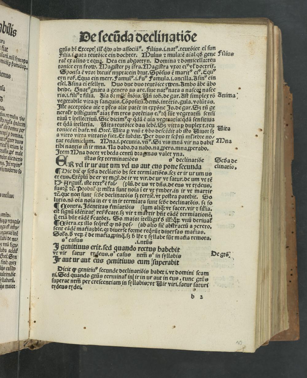 ¶ DHic dic ꝙ ſcða decliatio hz ſer termĩatiões. ſcʒ er ir urum us et eus.Exẽplũ de er vt mgf. de ir vt vir. de ur vt ſatur. de um vt tẽ E Arguit, iſte textꝰẽ fal/(plũ.de us vt dñs.de eus vt tydeus. ſus:ᷓ zc. Pꝛobat᷑ qꝛ młta ſi unt noia ĩ er vt ymberin ir vt martir ꝛc. que non ſunt ſcðe declinatõis ſʒ tertiẽ.vt poſtea atebit. So lutio.nõ oĩa noĩa in er ⁊ in ir termiata ſunt ſcðe declinatõis. ʒ ſo Qontra. Jdentitas t᷑mĩatiõis( r aliq̃:vt ſacer.vir ⁊ ſilia. ſignũ idẽtitat reiiſcateſʒ vir ⁊ mattir bñt eãdẽ termiationẽ. etiã bñt eãdẽ ſᷣcatõe;. So. maioꝛ itelligit s ill:qꝝ vnũ deriuat Qtra. ex illo ſeq̃ret᷑ ꝙ nõ poſ/(ab alio ſic abſtractũ a creto. ſent eãdẽ matiaʒ bĩe. qꝛ diuerſe foꝛme reqͥ rũt diuerſas matias.