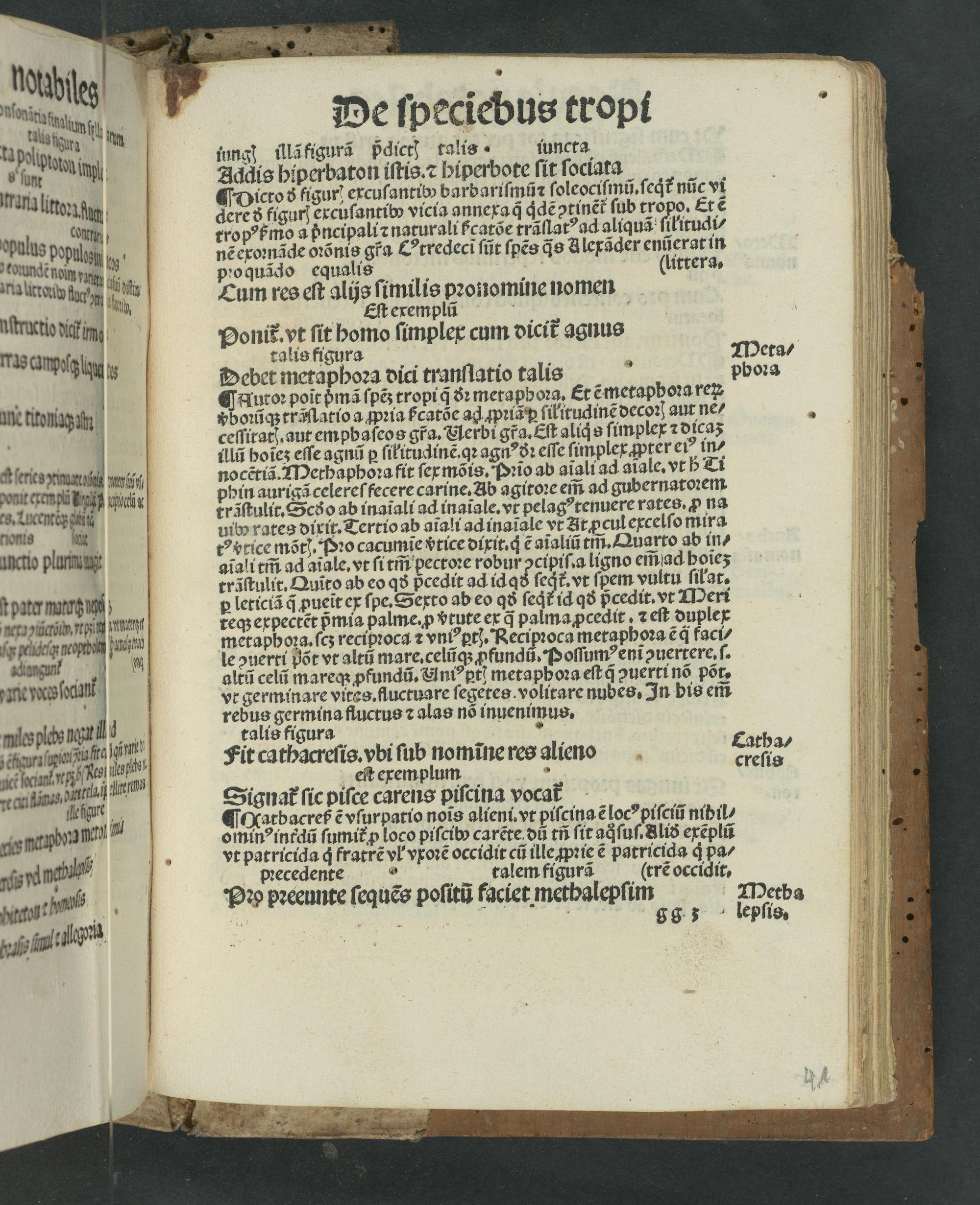 . 4ʃ* 2* 2 De ſpeciebus tropi inng illã figurã pᷣdictj talis · iuncta Addis hiperbaton iſtis.⁊ hiperbote ſit ſocdiaaa ¶ Oicro ð figur excuſantibꝰ barbariſmũ⁊ ſ oleociſmũ. ſeqt᷑ nũc vi gere ð figur excuſantib vicia annexa ꝗ̃ qdẽ ↄtinẽt᷑ ſub tropo. Et ẽ tropꝰmo a pᷣncipali ⁊ naturali ſᷣcatõe trãſlatꝰ ad aliquã ſiłitudi/ nẽ exoꝛnãde oꝛõnis gr᷑a Ctredeci ſũt ſpẽs qͥ̊s Aleãder enũerat in pꝛoquãdo equalis“ llittera. Cum res eſt alijs ſimilis pꝛonomine nomen 8 Fſt exemplũ Ponik vt ſit homo ſimplex cum dicit᷑ agnus talis figura. Debet metaphoꝛa dici tranſlatio talis ¶ Aurtoꝛ poĩt pᷣmã ſpẽʒ tropi q̃ ꝛ metaphoꝛa. Et ẽ metaphoꝛa reꝝ vᷣboꝛũq; trãſlatio a ꝓpꝛia ſᷣcatõe aq ꝓpꝛiãꝑ ſilitudinẽ decoꝛ aut ne/ ceſſitati.aut emphaſeos gr̃a. Verbi gr᷑a.Eſt aliqͥs ſ implex ⁊ dicaʒ illũ hoĩeʒ eſſe agnũ ꝑ ſilitudinẽ.qꝛ agnꝰ ðꝛ eſſe ſimplex ꝓpter eiꝰ in⸗ nocẽtiã. Methaphoꝛa fit ſex mõis. Pꝛio ab aĩli ad aĩale.vt b Ti phin aurigã celereſ fecere carine. Ab agitoꝛe em̃ ad gubernatoꝛem trãſtulit. Scðo ab inaiĩali ad inaĩale.vt pelagꝰtenuere rates.ꝓ na uibo rates dixit.Tertio ab aĩali ad inaĩale vt Bt cul excelſo mira tꝰvtice mõtj. Pꝛo cacumie vtice dixit.qͥ ẽ aĩaliũ tm.Quarto ab in/ aĩali tmñ ad aĩale. vt ſi tmñ pectoꝛe robur ↄcipiſ.a ligno em̃ ad hoĩeʒ trãſtulit. Quĩto ab eo qð pᷣcedit ad id qð ſeqt᷑.vt ſpem vultu ſilat. ꝑ leticiã q̃ pueit ex ſpe. Sexto ab eo qð ſeqt᷑ id qð pᷣcedit.vt Meri teqʒ expectẽt pᷣmia palme.p vᷣtute ex q̃ palma ꝓcedit. ⁊ eſt duplex metaphoꝛa. ſcʒ recipꝛoca ⁊ vniꝰ ꝑtꝭ. Recipꝛoca metaphoꝛa ẽ q̃ faci/ le ↄuerti Põt vt altũ mare. celũq; ꝓfund. Poſſumꝰ eni oↄuertere, ſ. altũ celũ mareq; ꝓfundũ. Vniꝰ ꝑti metaphoꝛa eſt q̃ ↄuerti nõ põt. vt germinare vites.fluctuare ſegetes. volitare nubes. In bis em̃ rebus germina fluctus ⁊ alas nõ inuenimus. talis figura. Fit cathacreſis.vbi ſub nomĩne res alieno eſt exemplum Signat ſic piſce carens piſcina vocuũ ¶ Qatbacreß ẽ vſurpatio noĩs alieni.vt piſ cina ẽ locꝰ piſciũ nibil/ ominꝰintdũ ſumit᷑ p loco piſcib carẽte dũ tñ ſit aqſuſ.Slið exẽplũ vt patricida qͥ fratrẽ vł vxoꝛẽ occidit cũ ille,pꝛie ẽ patricida qͥ pa/ precedente 6 calem figurã(trẽ occidit. Pꝛo pꝛeeunte ſequẽs poſitũ faciet methalepſim