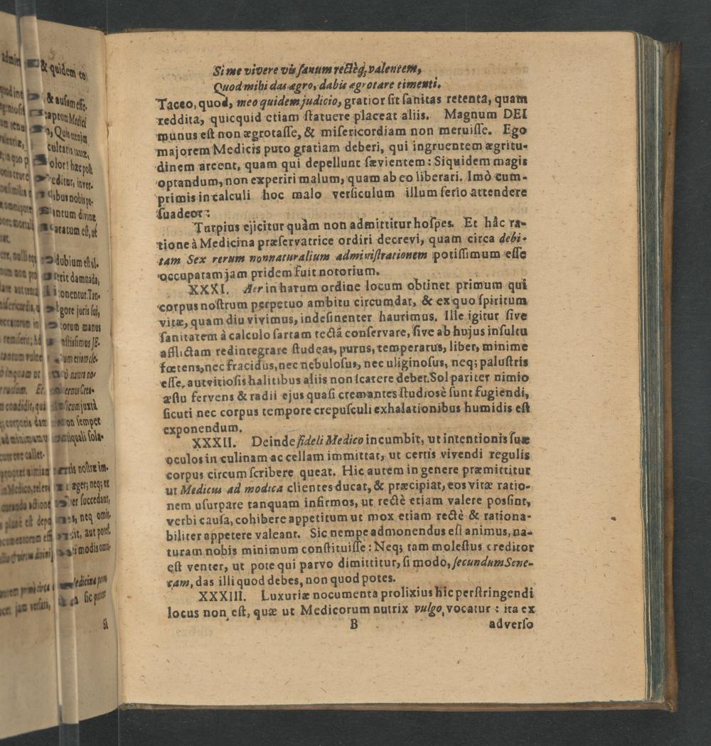 ſuadeor: L Turpius ejicitur quàm non admittitur hoſpes. Et häc ra- tione à Medicina præſervatrice ordiri decrevi, quam circa debi tam Sex rerum nonnaturalium admi miſirationem potiſſimum eſſe occuparam jam pridem fuit notoriuumm. XXXI. Aer in harum ordine locum obtinet primum qui corpus noſtrum p erpetuo ambitu circumdat,& ex quo ſpiritum vitæ, quam diu vivimus, indeſinenter haurimus. Ilie igitur ſive ſanitatem à calculo ſartam tedã conſervare, ſive ab hujus inſaltu afflictam redintegrare ſtudeas, purus, temperarus, liber, minime fœtensnec fracidus, nee nebuloſus, nec uliginoſus, neq; paluſtris eſſe, autvitioſis halitibus aliis non ſcatere deber. Solpariter nimio æſlu fervens& radii ejus quaſi cremantes ſtud iosè ſunt fugiendi, ſicuti nec corpus tempore crepuſculi exhalationibus humidis eſt exponendum.—“ XXXII. Deinde fdeli Meaico incumbit, ut intentionis ſuæ oculos in culinam ac cellam immittat, ut certis vivendi regulis corpus circum ſcribere queat. Hie autem in genere præmittitur ur Medicus ad modica clientes ducat,& præcipiat, eos vitæ ratio-