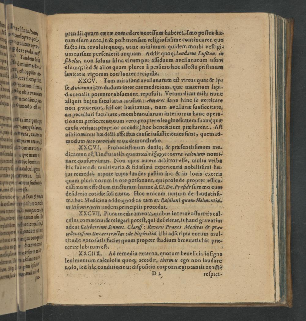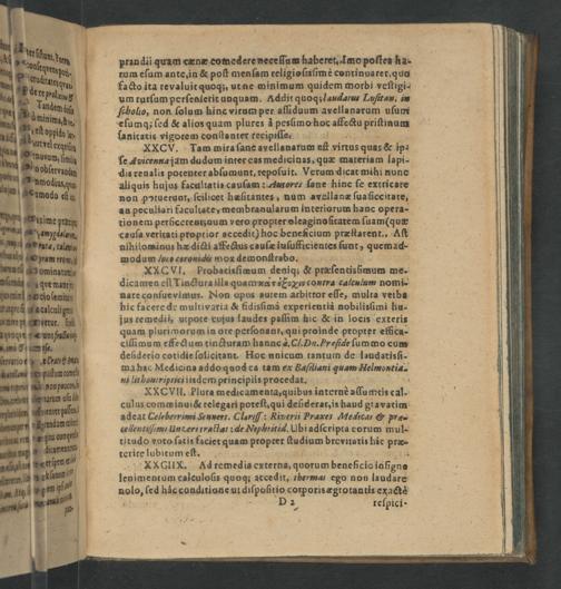 eſumq; ſed& alios quam plures à pesſimo hoc affectu priſtinum ſanicatis vigotem conſtanter recipiſe XXCV. Tam mira ſane avellanarum eſt virtus quas& ip⸗ ſe Avicenna jam dudum inter eas medicinas, quæ materiam lapi- dis renalis pocenter abſumunt, repoſuit. Verum dicat mihi nune aliquis hujus facultatis cauſam: Aatores ſane hinc ſe extricare non potueruat, ſcilicet hæſitantes, num avellanæ ſua ſiccitate, au peculiari facultate, membranularum interiorum hanc opera- tionem perficerentznum vero propter oleaginoſiratem ſuam(quæ cauſa veritati proprior accedit) hoc beneficium præſtarent., Aſt nihilominus hæ dicti affedus cauſæ iuſufficienics ſunt, quemad- modum oco coroxidts mox demonſtraoobq. XXCVI. probacisſimum deniq;& præſentisſmum me. dicamen eſt Tinduta illa quamxcr εοꝓανρν νtra calculum nomi- nare conſuevimus. Non opus autem atbittor eſſe, multa vetba hic facere de multivaria& fidisſimà experientià nobilisſimi hu- jus remedii, ucpote cujus laudes paſſim hic& in locis exteris quam pluriworum in ore perſonant, qui proinde propter effica- ciſſimum effe tum tincturam hannc à. Cl. Da. Eraſide ſum mo cum deſiderio cotidie ſolicitant. Hoc unicum tantuin de laudatisſi- mahac Medicina addo quodea tam ex Baſcliani quam Helmontia- ni lithontriptici iisdem principiis procedat.“ XXCVII. Plura medicamenta, quibus internè aſſamtis cal. culus comminui& relegari poreſt, qui deſiderat, is haud gravatim adeat Celeberrimi Seunert. Clariſſ: Riverii Praxes AMeaicas& præ- ce lentiſſimi Unzeri tractat: de Nephritid. Ubi adſcripta corum mul- titudo voto ſatis faciet quam propter ſtudium brevitatis hie præ- terire lubitum eſtet. 2 4 XXGIIX. Adremedia externa, quorum beneſicio iaſigne lenimentum calculoſis quoq́; accedit, thermas ego nob laudare nolo, ſed häc conditione ui diſpoſtio corporis ægrotantis exact 1 D 2 reſpici-