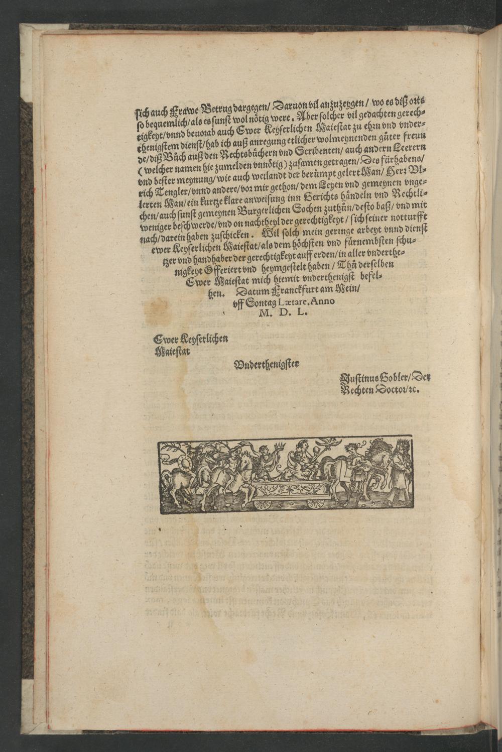 d bequemlich/ als es ſeßſ wolnoͤtig were. ſeieat,chehn auch Swer Keyſ erlichen Kaieſtat zu ehan vnd vnder⸗ chenigſtem dienſt/ hab ich auß anregung etlicher wolmehnenden guͤter freun de/ diß Buͤch auß den Bechtsbuͤchern vnd Scribenten/ auch andern Seerern (welcher namen hie zumelden vnnoͤtig zuſamen getragen/ Deo für habens/ ond beſter mehnung/ wie auch weilandt der berumpt gelert Nan/ Herꝛ Bl⸗