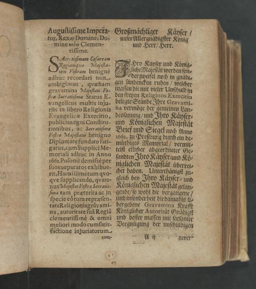 adhuc recordari non- ambigimus, qvæham gravamina Majeſtati Ve- ſtræ Jacrarilimæ Status E- vangelicus multis inju- riis in libero Religionis Evangeliceæ Exercitio, publicisnegni Conſtitu- tionibus, ac Sacratuſimæ loſtreæ Majeſtatu benigno Diplomate fundato fati- gatus, cCumSupplici Me- moriali adhuc in Anno 1662, Poſonii demifsè per fſuospeputatos exhibue- rit. Humillimetum qvo- qve ſupplicando, qvate- nus Majeſtas Veſtra Jacratis- fima tam præterita ae in ſpecie eò tum repræſen- tataReligionisgravami- na, autoritate ſuà Regiaà