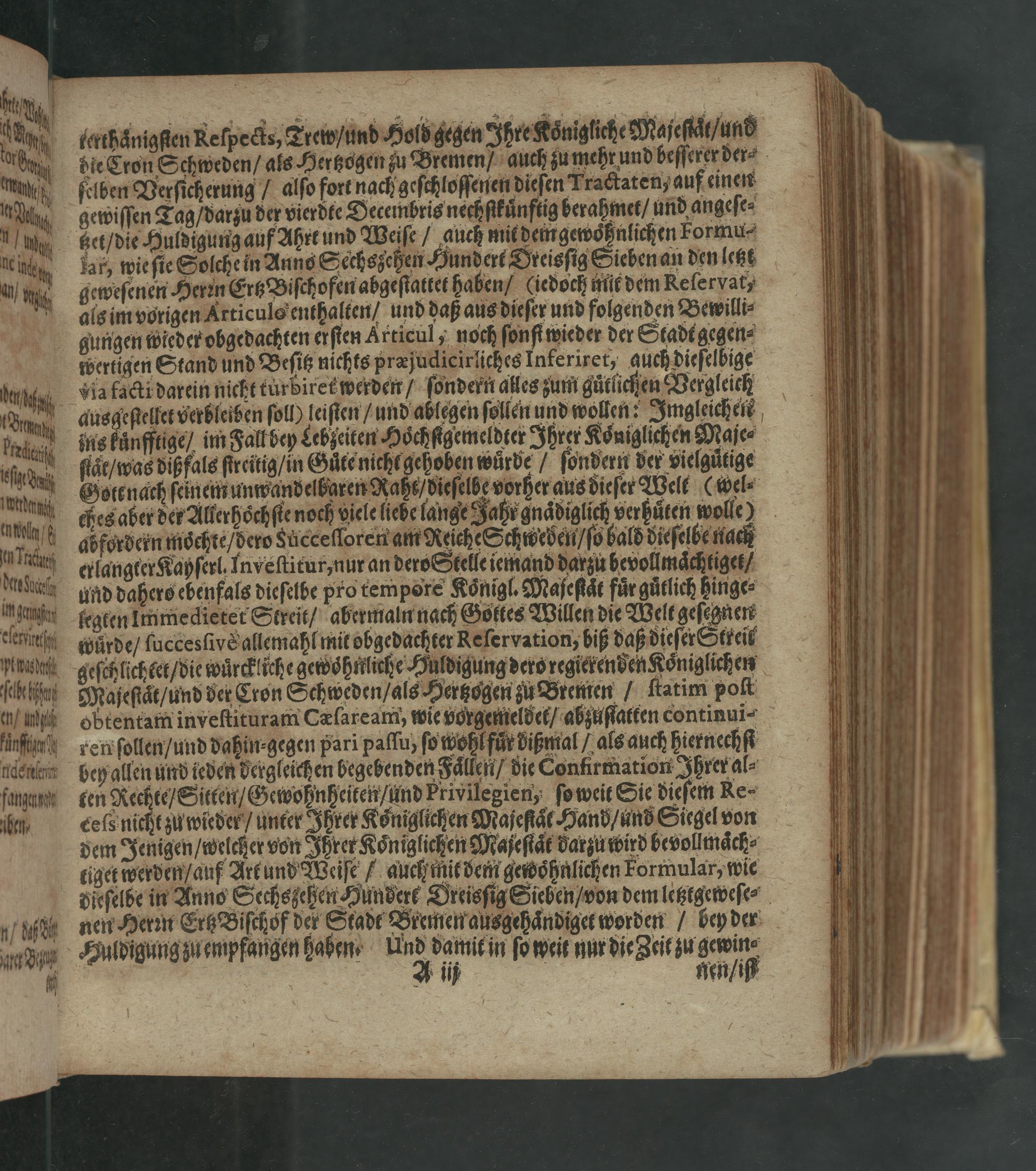 ches aber der Allerhoͤchſte noch viele liehe lange Jahr gnaͤdiglich verhuͤten wolle) abfordern moͤchte/ dero Kuͦcceſſoren am Reiche Sch weden/ ſo bald dieſelbe nach erlangter Kayſerl. Inveſtitur, nur an dero Stelle iemand darzu bevollmaͤchtiget/ und dahero ebenfals dieſelbe pro tempore Koͤnigl. Maſeſtaͤt fuͤrguͤllich hinge⸗ legten Immedietet Streit/ abermaln nach Goltes Willen die Welt geſegnen würde/ fuccesſivè allemahl mit obgedachter Reſervation, biß daß dieſer Streil Huldigung dero regierenden Koͤniglichen Majeſtat/ und der Eron Schweden/ ais Hertzogen zu Stemen/ ſtatim poſt obtentam inveſtituram Cæſaream, wie vorgemeldet/ abzuſtatten continui- rem ſollen/ und dahin⸗gegen pari paſſu, ſo wohl fuͤr dißmal/ als auch hiernechſi beyallen und ieden dergleichen begebenden Faͤllen/ die Confirmation Ihrer al⸗ ten Rechte/ Sitten/ Gewohnheiten/ Und Privilegien, ſo weit Sie dieſem Re⸗ ceſs nicht zu wieder/ unter Ihrer Koͤniglichen Maſefiaͤt Hand/ und Siegel von dem Jenigen/ welcher von Ihrer Koͤniglichen Majeſtaͤt darzu wird bevollmaͤch⸗ tiget werden/ auf Ark und Weiſe/ auch mit dem gewoͤhnlichen Formular, wie dieſelbe in Anno Sechszehen Nundert Dreisſig Sieben/ von dem letztgeweſe⸗ nen Heren Ert Biſchof der Stade Bremenausgehaͤndiget worden/ beyder Huldigung zu empfangen haben. Ana aunem ſo weit nur die Zei kau genin A nj nen/ iß