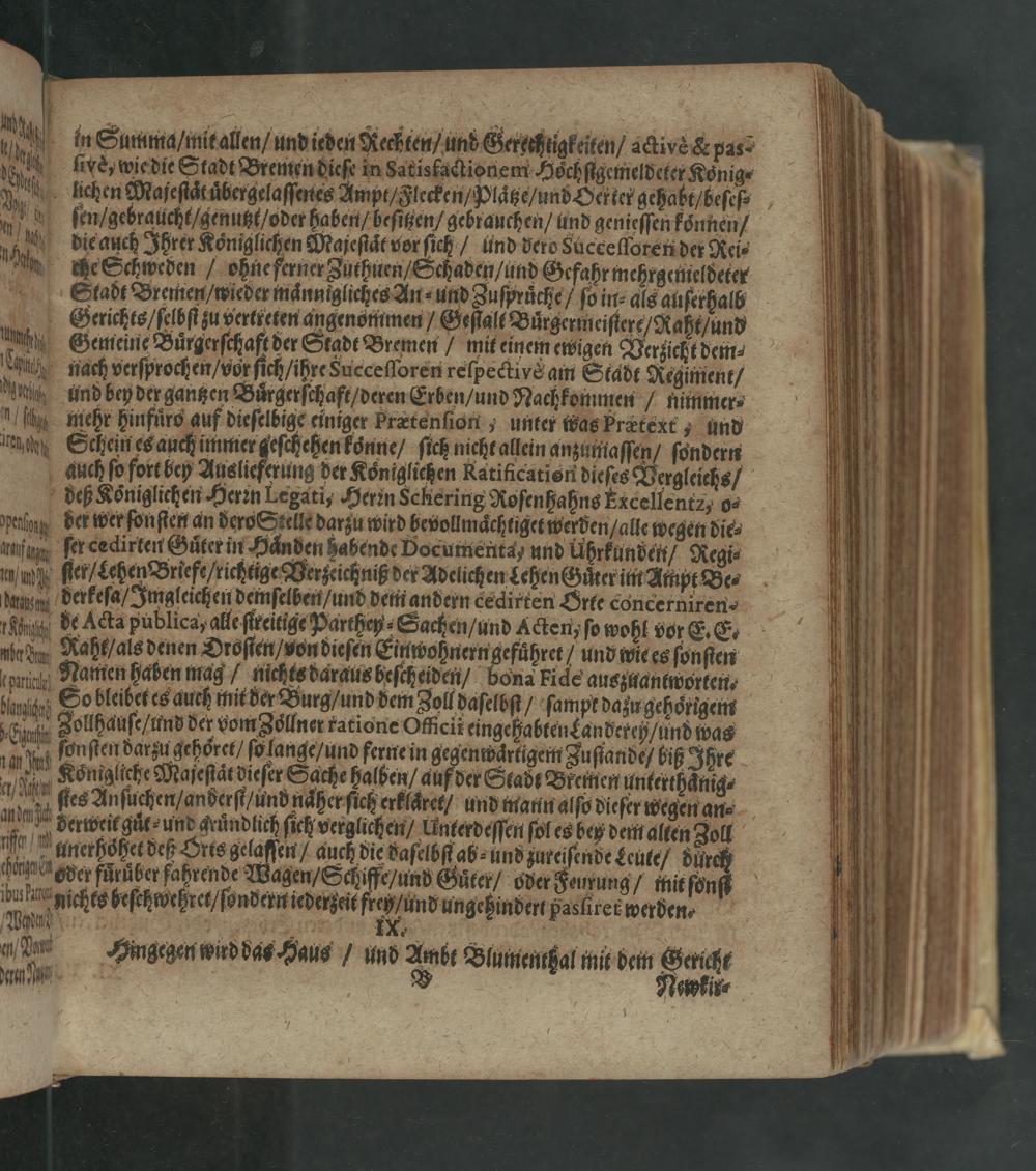 uaſ Gemeine Buͤrgerſchaft der Stadt Bremen/ mit einem ewigen Verzicht dem⸗ Lnni nach verſprochen/ vor ſich/ ihre Sueceſſoren reſpectiyè am Stadt Regiment/ une und beydergantzen Buͤrgerſchaft /deren Erden/ und Nachkommen/ nimmer. ſtht mehr hinfuͤro auf dieſelbige einiger Prætenſion; unter was bratext, und inace Schein dahuer eson ane, ſich nieht allein anzumaaſſen/ ſondern auch ſo fort bey Auslieferung der Koniglichen Ratificatien dieſes? keergleiehs/ deß Koͤniglichen Herꝛn Legati, Herin Schering Noſenhahns Excellentz, o⸗ dring der werſonſienan daoSStelt darzu wir bevollmüchtigetwerden/allewegen die⸗ anſen fercedirten Guͤterin anden habende Documenta) und Uhrkunden/ Regi⸗ nm er Lehen Dricfe richeige Verzeichniß der Adelichen Lehen Guͤter im Ampt Be⸗ nen derkeſa/ Imgleichen demſelben/ und dem andern cedirten Orke concerniren⸗ 1it de Acka publicar alle ſreitige Parthey⸗Sachen/ und Acten ſo wohl vor E. E. nhadn Naht,als denen Droſten wondieſen Einwohnerngefuͤhret/ und wiets ſonſten nnis Tantenbabenmag, niehce daraus beſchaden, bona ride auszaantworten. untet Sobleibetes aurh mit der Burg/ und dem Joll daſelbſt/ ſampt dazu gehoͤtigem Ents Follhauſe,umd der vom Jolne ratione Oſcik ingehabten andereh/ und was In het ſnſtendarzugehoret ſolange/ und feme in gegen aͤrigem Zuſtande biß Ihre dl enn Koͤngglicke Mafeſtaͤt dieſer Sache halben/ auf der Stadt Bremen unterthaͤnig⸗ de ue ſtes Anſuchen/ anderſi/ und naͤher ſich erklaͤret/ und mann alſo dieſer wegen an⸗ andmg Berweit guͤt⸗ und gruͤndlich ſich verglichen/ Uinterdeſſen ſol es bey dem alten Zoll rffer m unerhoͤhet deß Orts gelaſſen/ auch die daſelbſt ab⸗ und zureiſende Leute/ eau