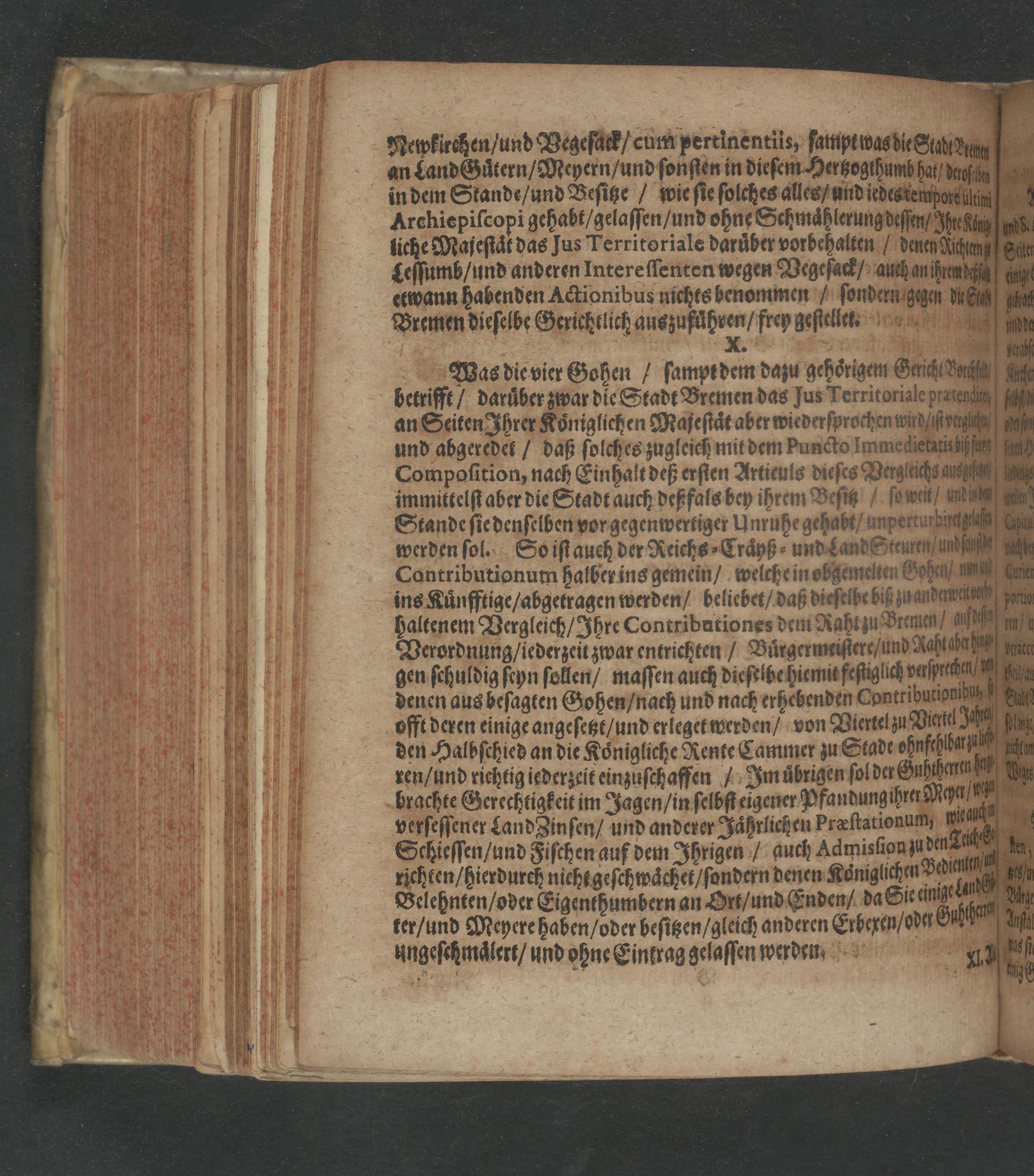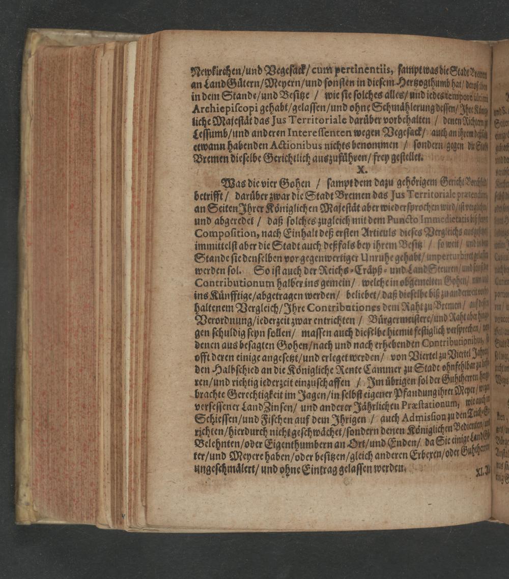 Newkirchen/ und Begeſack/ cum pertinentiis, ſampt was die Stadiagg. an Land Guͤtern/ Meyern/ und ſonſten in dieſem Hertzogthumb hat/ danſa in dem Stande/ und Beſitze/ wie ſie ſolches alles/ und iedes tempans ultin Archiepiſcopi gehabt/ gelaſſen/ und ohne Schmaͤhlerungdeſſen/ Ihr— 35 liche Maieſtaͤt das Jus Territoriale daruͤber vorbehalten/ denen Auchian eh Leſſumb/ und anderen Intereſſenten wegen Vegeſack/ auch an ißten eet g etwann habenden Actionibus nichts benommen/ ſondern gegen dEi aue Bremen dieſelbe Gerichtlich auszufuͤhren/ frey geſtelle Was die vier Gohen/ ſampt dem dazu gehoͤrigem Gericht Ventzſtſ ga⸗ betrifft/ daruͤber zwar die Stadt Bremen das jus Territoriale pratendtts fuſi an Seiten Ihrer Koͤniglich en Majeſtaͤt aber wiederſprochen wind iſtvegitte t und abgeredet/ daß ſolches zugleich mit dem Puncto Immedietatis iißſttt ih Compoſition, nach Einhalt deß erſten Artieuls dieſes Bergleichs autſſtt ti immittelſt aber die Stadt auch deßfals bey ihrem Beſitz/ ſo weit/ andiitt z Stande ſie denſelben vor gegenwertiger Unruhe gehabt/ unperturbiaguſt Kaza werden ſol. So iſt auch der Reichs⸗Craͤyß⸗ und Land Steuren/ undſenſts ast Contributionum halber ins gemein/ welche3in obgemelten Gohen, nin ins Kuͤnfftige/ abgetragen werden/ beliebet/ daß dieſelhe biß zu andereimi haltenem Vergleich/ Ihre Contributiones dem Raht zu Bremen aüfdiſ Verordnung/ iederzeit zwar entrichten/ Buͤrgermeiſtere/und Nahl haet an gen ſchuldig ſeyn ſollen/ maſſen auch dieſelbe hiemit feſiglich vetſprchen i t