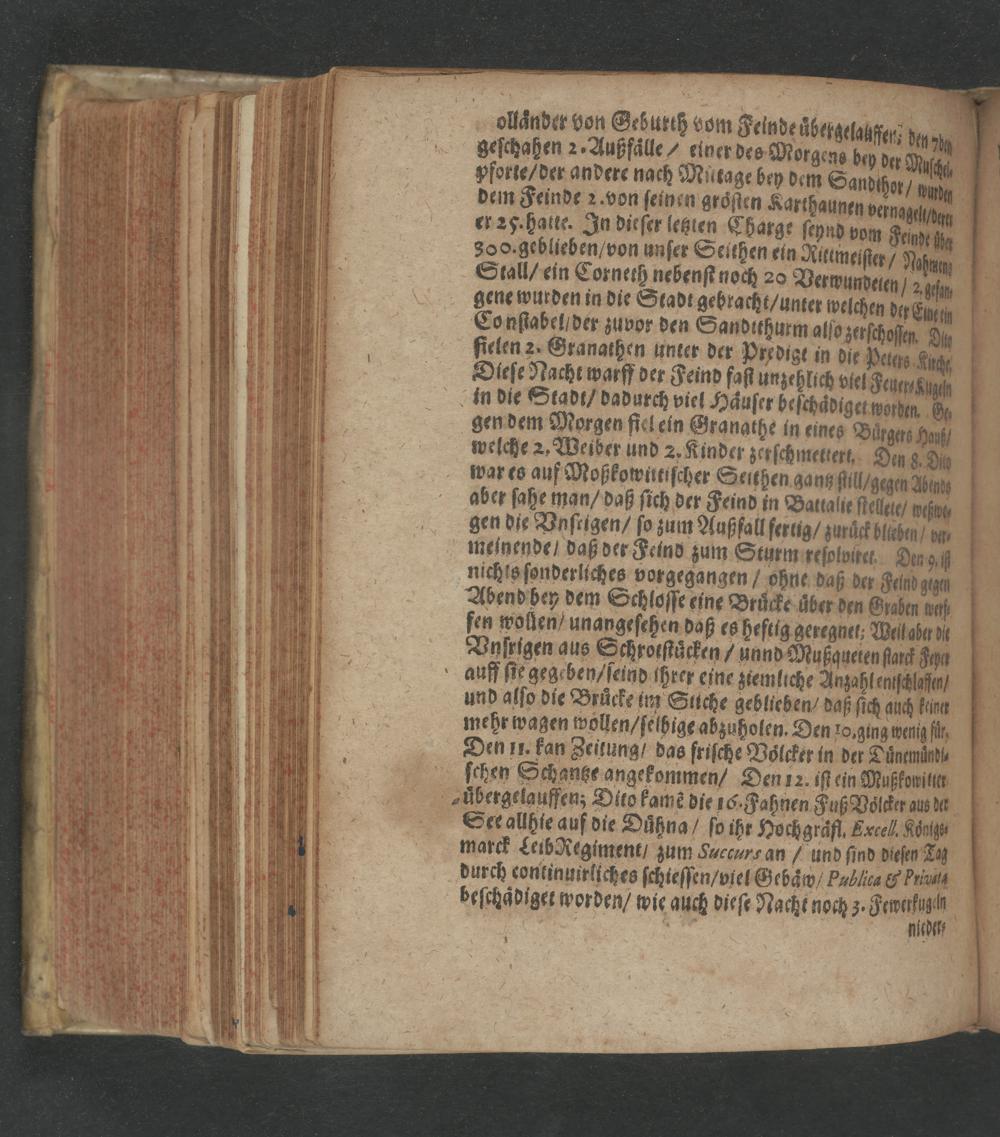 ollaͤnder von Geburth vom Feinde uͤbergelauffen, den vin b geſchahen 2. Außfaͤlle/ einer des Morgens bey der Muſ 1 pforte/ der andere nach Muttage bey dem Sand ot/ n4 dem Feinde 2. von ſeinen groͤſien Karthaunen vernagelſdan er 25. hatte. In dieſer letzten Charge ſeynd vom Feinde k 300. geblieben/ von unſer Seithen ein Rittmeiſter/ N um Stall/ ein Corneth nebenſt noch 20 Verwundeien 12 grfun gene wurden in die Stadt gebracht/ unter welchen dein Eo nſiabel/ der zuvor den Sandtthurm alſo zerſchoſſe Di fielen 2. Granathen unter der Predigt in die Peters Kiche Dieſe Nacht warff der Feind faſt unzehlich viel FeueneKugal