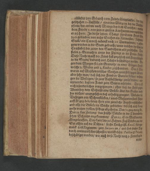 in die Stadt/ dadurch viel Haͤuſer beſchaͤdiget wotden Ge gen dem Morgen fiel ein Granathe in eines Buͤrgers Hanz welche 2. Weider und 2. Kinder zerſchmettert, Den 9. Dio war es auf Moßkowiltiſcher Selthen gant ſtill/ gegen Abends aber ſahe man/ daß ſich der Feind in Battalte ſtelete/ neßte gen die Vnſtigen/ ſo zum Außfall fertig/ zuruͤck bliehen, a. meinende/ daß der Feind zum Sturm reſolvitet. Den 9,1 nichts ſonderliches vorgegangen/ ohne daß der Feind gegn Abend bey dem Schloſſe eine Bruͤcke uͤber den Giaben duß fen wollen/ unangeſehen daß es heftig geregnet; Wallaba di Vnſrigen aus Schrotſtaͤcken/ unnd Mußaueien ſund Fenn auff ſie gegeben/ ſeind ihrer eine ziemliche Anzahl entſchlaſſn/ und alſo die Bruͤcke im Stiche gebliehen/ daß ſich auch kan mehr wagen wollen/ ſeibige abzuholen. Den 10,zing wenig i Den 1n kan Zeitung/ das friſche Voͤlcker in der Duͤnemäͤrde ſchen Schante angekommen/ Den 12. iſt ein Mußkonitte
