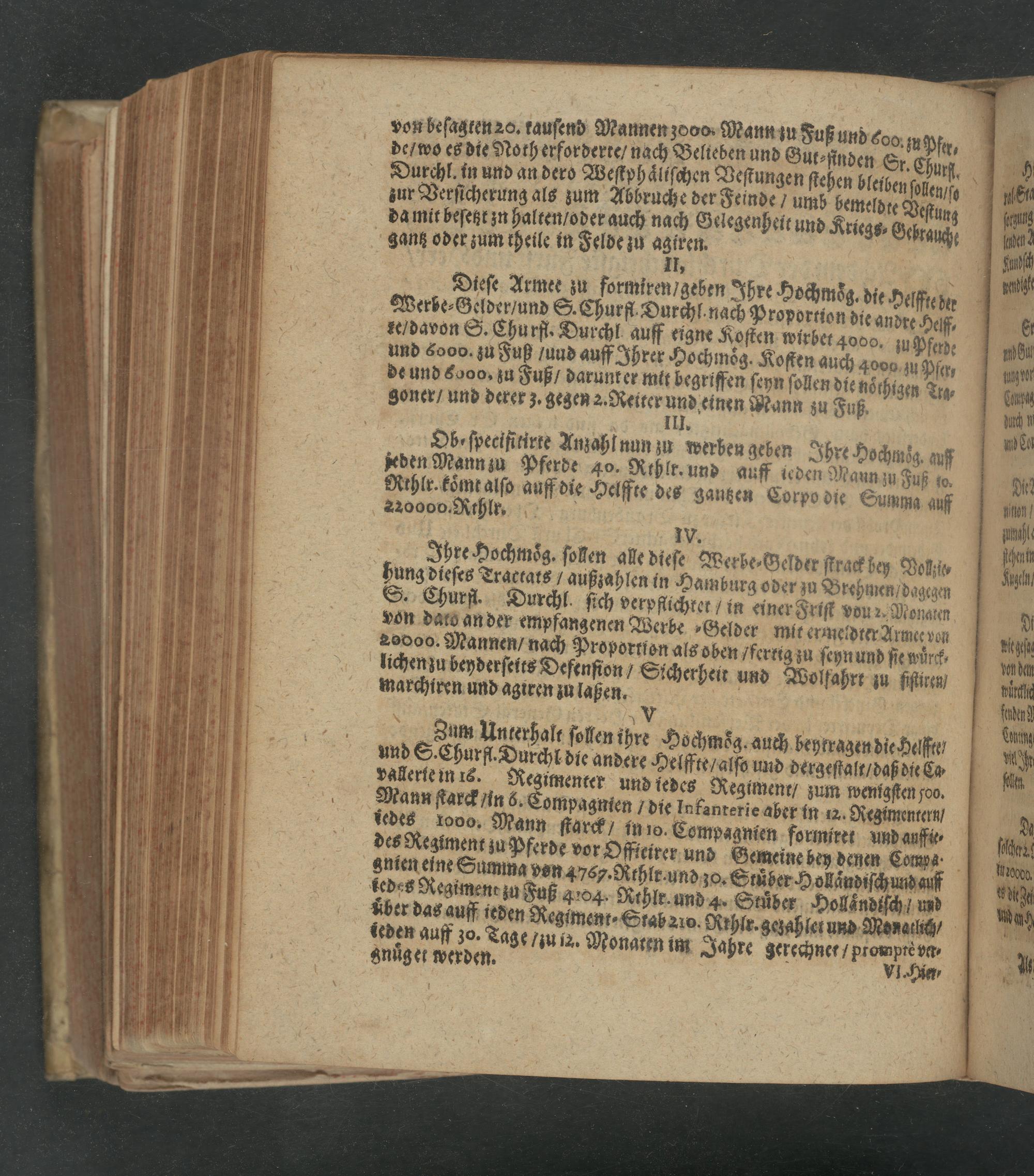 Zum Unterhalt ſollen ihre Hochmoͤg. auch beytragen die Helffte/ und S. Churfl. Durch kdie andere Helffte/ al ſo und dergeſtalt/ daß die Ca⸗ vallerte in 1. Regimenter und iedes Regiment/ zum wenigſten /oo. Mann ſtarck/ in 5. Compagnien/ die Inkanterie aber in 12. Regimentern/ kedes 1000. Mann ſtarck/ in 10. Compagnien formiret und auffi⸗ des Regiment zu Pferde vor Offieirer und Gemeine bey denen Compa⸗ snien eine Summa ven 4767. Rthlr. und z0. Stuͤber Holaͤndiſch und auf