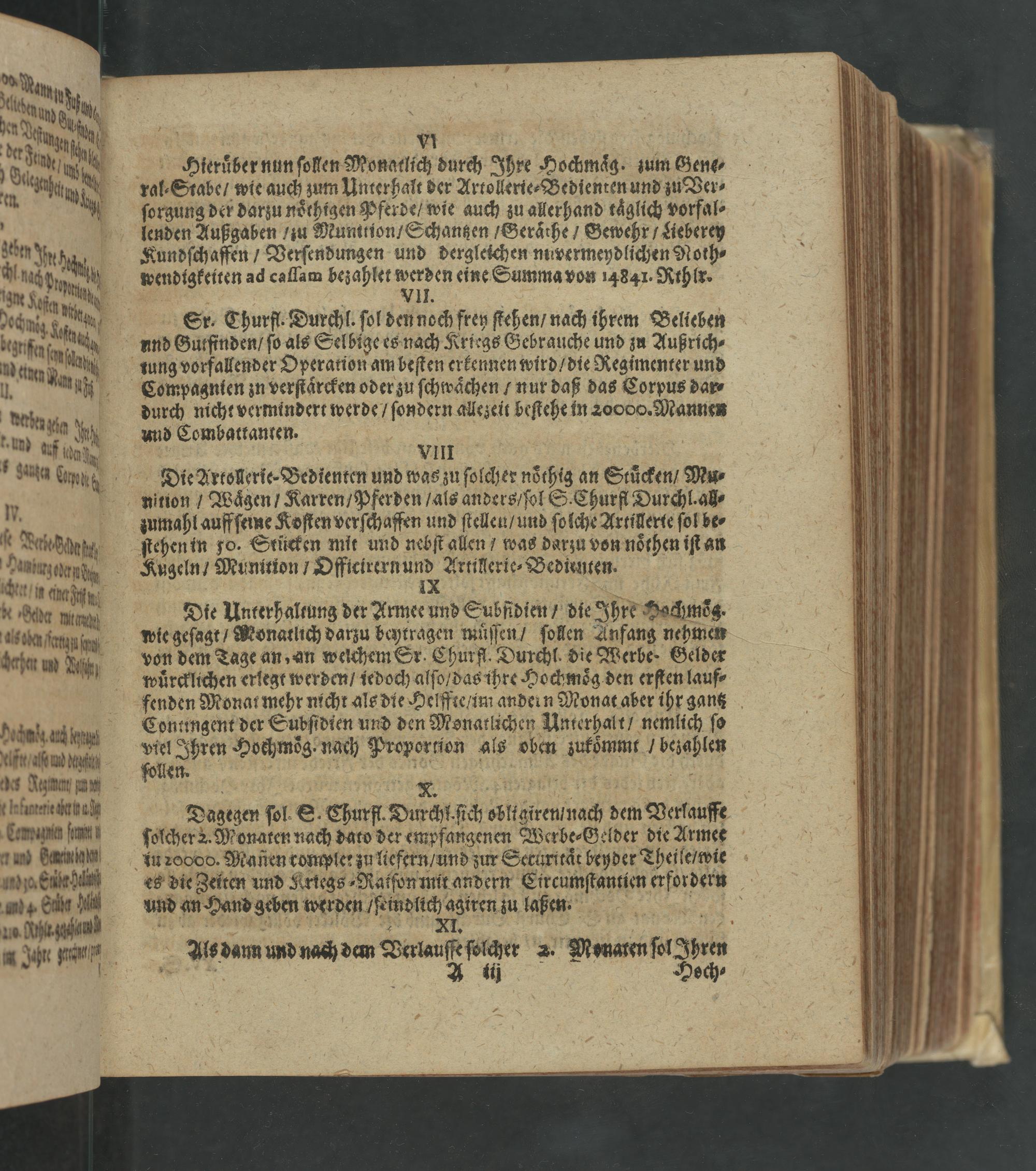 Dagegen ſol S. Churfl. Durchl ſich obligiren! nach dem Verlauffe ſolcher z. Monaten nach datv der empfangenen Werbe⸗Gelder die Armee 1u 20000. Manen rompler zu liefern/ und zur Securitaͤt beyder Theile/ wie es die Zeiten und Kriegs⸗Ratſonmit andern Eircumſtantien erfordern