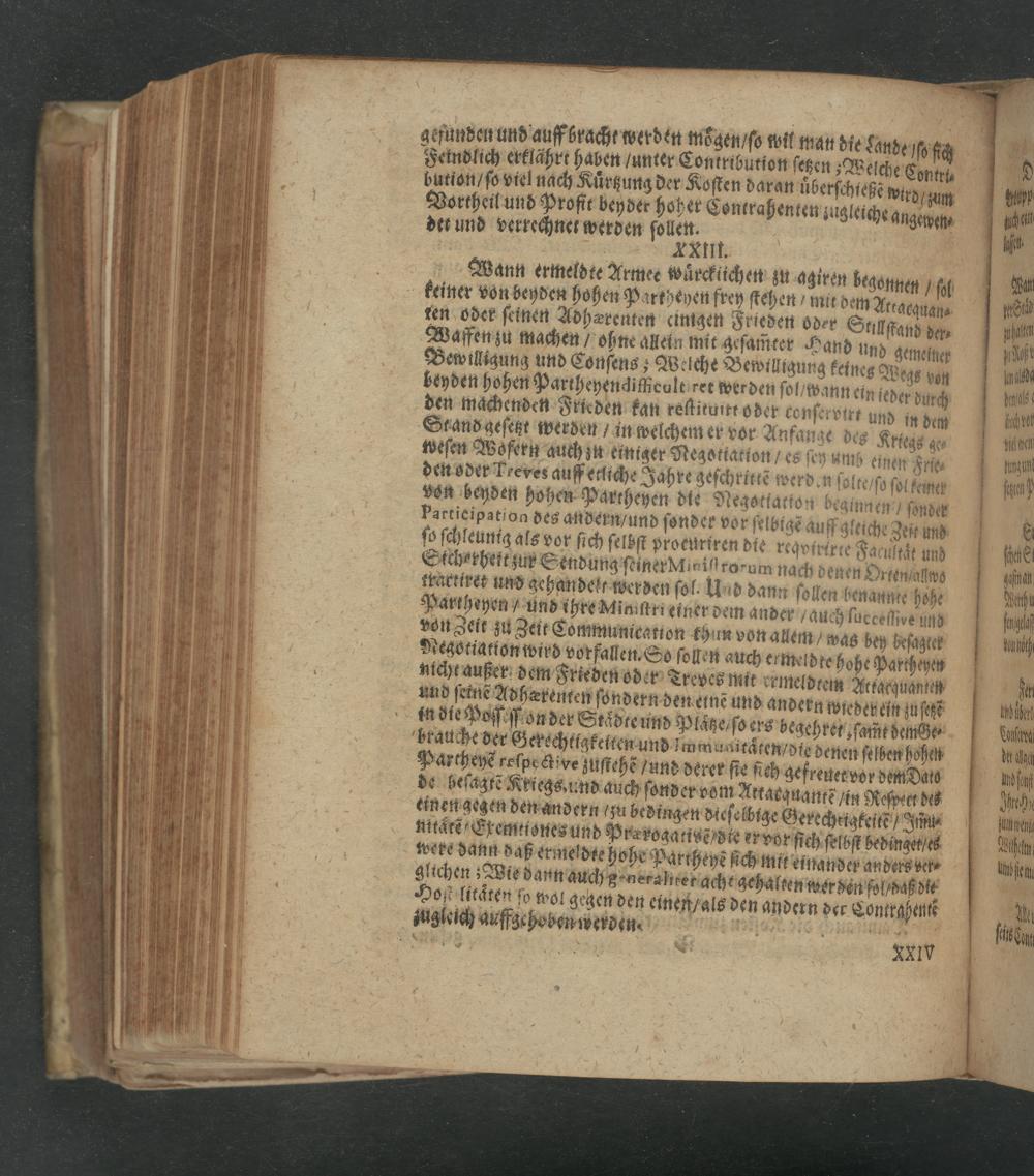 gefunden und auff bracht werden moͤgen/ ſo wil man die Lande ſſo ſich Feindlich erklährt haben unter Contribution ſetzen; Welche Contri⸗ bution/ ſo viel nach Kuͤrtzung der Koſten daran uͤberſchieße wird, zum Vortheil und Proftt beyder hoher Contrahenten zugleiche angewen⸗ der und verrechnet werden ſollen. XXtII.. Wann ermeldte Armee wuͤrckiichen zu agiren begonnen/ ſol auan⸗ ken oder ſeinen Adharenten cinigen Frieden oder Sullſtand der⸗ Waffen zu machen/ ohne allein mit geſamter Hand und gemeiner Bewilligung und Conſens; Welche Bewilligung keines Wegs von beyden hohen Partheyendiſheult ret werden ſol/ wann ein jeder durch den machenden Frieden kan reſtituntt oder konſervirt und in dem Stand geſetzt werden/ in welchem er vor Anfange des Kriegs ge⸗ weſen Woͤfern auch zu einiger Negotiatton/ es ſey umb einen Frie⸗ den oder Treves auff etliche Jahre geſchritte werden ſo lte/ ſo ſol keinen von beyden hohen Partheyen die Negottatton beginnen, ſonder Partieipation des andern/ und ſonder vor ſelbige auff gleiche Zeit und ſo ſchleunig als vor ſich felbſt procuriren die regvirirte Facultaͤt und Stcherheit zur Sendung ſeiner Maiſtrorum nach denen Orten allwo krartiret und gehandelt werden ſol. Und dann ſollen benannte hoße Partheyen/ und ihre Miniſtri einer dem ander/ auch ſucceſſive unld von Zeit zu Zeit Communicatton thun von allem/ was bey beſazter Negotiation wird vorfallen. So ſoll en auch ermeldte hohe Partheyen nicht außer dem Frieden oder Treves mit ermeldtem Attacquante und ſeine Adharenten ſondern den eine und andern wiedeyein zu ſeße in die Poſſeſſon der Staͤdte und Plaͤtze/ ſo ers begehrer, ſamt deiGze⸗ brauche der Gerechtigkeiten und umu aitaͤten/ die denen ſelben hoßen Partheye reſpe ctive zuſtehe und derer ſie ſich gefreuet vor dem Dato de beſagté Kriegs, und auch fonder vom Artacquante /in Reſpeet des einen gegen den andern zu bedingen dieſelbige Gerechrigkeite/ Iſhu⸗ nitaͤtẽ/ Exemtiones und Prærogative/ die er vor ſich ſelbſt bedinget/es mit einander an ders ver⸗ glichen; Wie dann auch generalieer ache gehalten wer den ſoldaß die Hoſt litaͤten ſo wol gegen den einen/ als den andern der Contrahente „werden