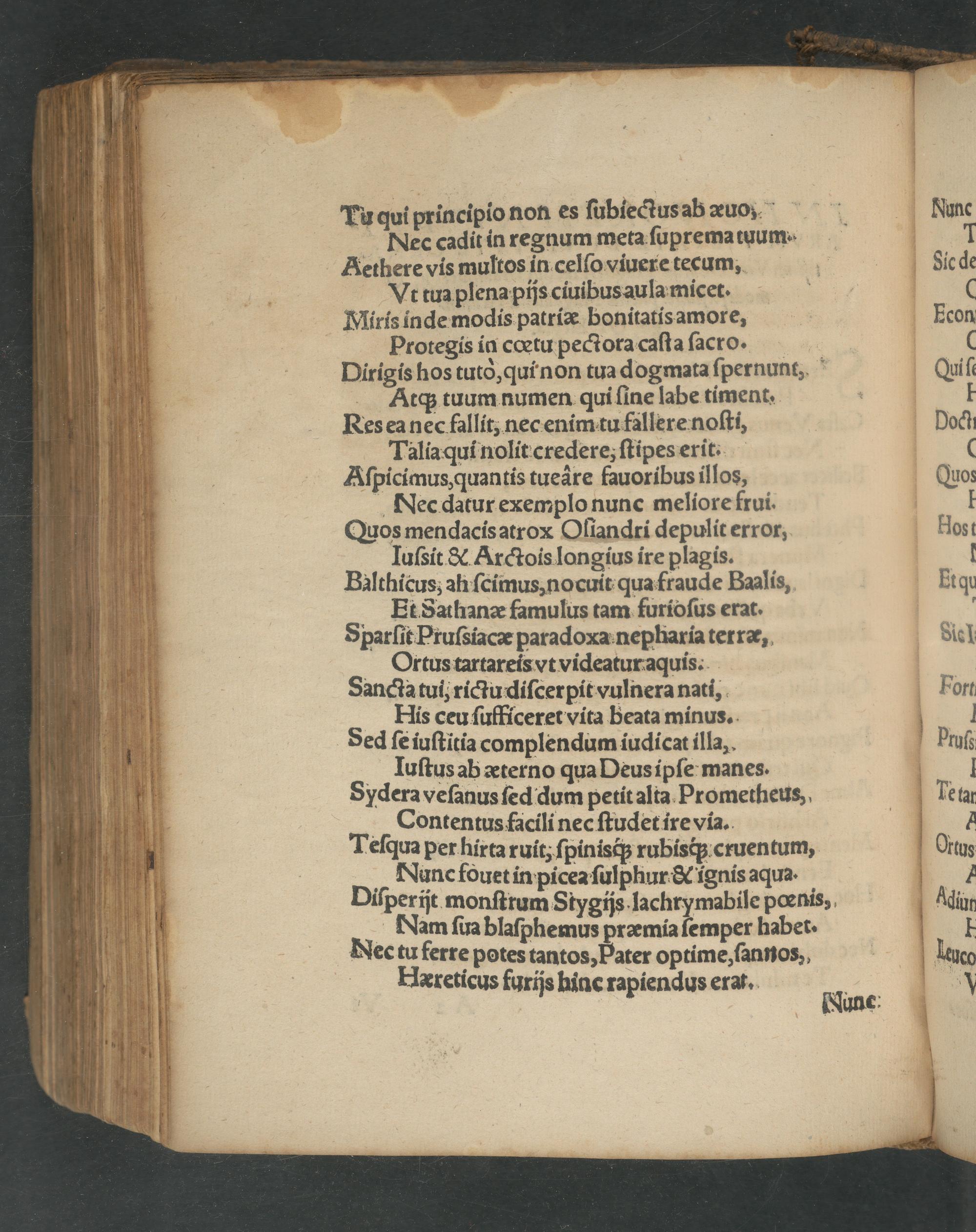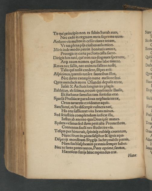 Tu qui principio non es ſubiectus ab æuo Nec cadit in regnum meta ſuprema tuum. Aethere vis multos in celſo viuere tecum, Vvt tua plena pijs ciuibus aula micet. Miris inde modis patriæ bonitatis amore, Protegis in cœtu pectora caſta ſaeo. Dirigis hos tutò, qui non tua dogmata ſpernunt, Atq; tuum numen qui ſine labe timent.: Res ea nec fallit, nec enim tu fallere noſti, Talia qui nolit credere, ſtipes erit. Aſpicimus, quantis tuere fauoribus illos, ec datur exemplo nunc meliore frui. Quos mendacis atrox Oſiandri depulit error, Iuſsit& Arctois longius ire plagis. Balthicus, ah ſcimus, nocuit qua fraude Baalis, Et Sathanæ famulus tam furioſus erat. Sparſit Pruſsiacæ paradoxa nepharia terræ, Ortus tartareis vt videatur aquis. Sancta tui, rictu diſcerpit vulnera nati, Hiss ceu ſufficeret vita beata minus. Sed ſe iuſtitia complendum iudicat illa, Huſtus ab æterno qua Deus ipſe manes. Sydera veſanus ſed dum petit alta Prometheus, Contentus facili nec ſtudet ire via. Teſqua per hirta ruit, ſpinisq́; rubisq; cruentum, Nuͤnc fouet in picea ſulphur& ignis aqua. Diſperijt monſtrum S tygijs lachrymabile pœnis, Nam ſua blaſphemus præmia ſemper habet. Nee tu ferre potes tantos, Pater optime, ſannos, Hæreticus furijs hinc rapiendus erat.