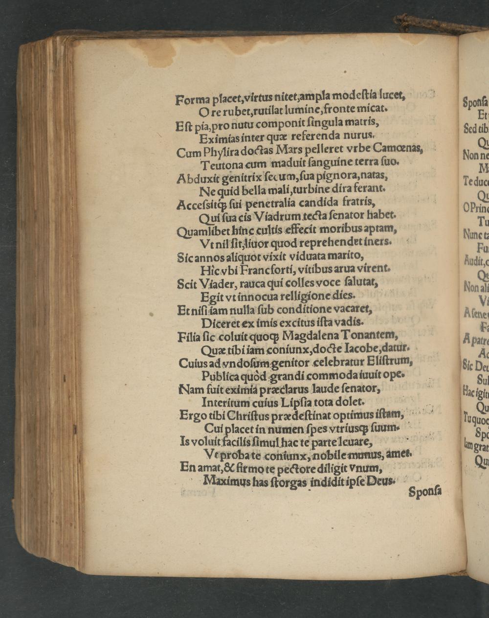 Et niſtiam nulla ſub conditione vacaret, N. Diceret ex imis excitus iſta vadis. Klene Filia ſic coluit quoq; Magdalena Tonantem, K Qux tibi iam coniunx, docte Iacobe, datur. Patre Cuius ad vndoſum genitor celebratur Bliſtrum, 8 5 Publica quòd grandi commoda iuuit ope. dle Dei Nam fuit eximia præclarus laude ſenator, Su Interitum cuius Lipſia tota dolet..“ ac igit Ergo tibi Chriſtus prædeſtinat optimus iſtan,- Q Cui placet in numen ſpes vtriusq; ſuum.. uquoc