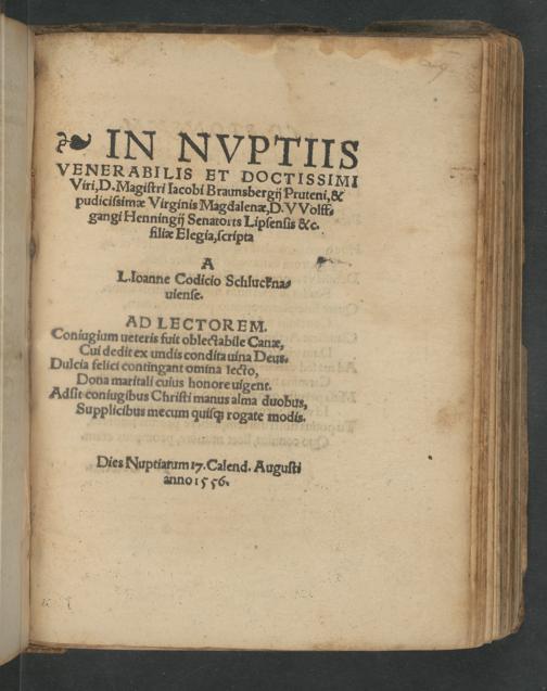VENERABILIS ET DOCTISSIMI Viri,D. Magiſtri Iacobi Braunsbergij Pruteni,& Pudiciſsimæ Virginis Magdalenæ, D. V Volſft⸗— gangi Henningij Senatorts Lipſenſis&c. illia Blegia, ſcripta