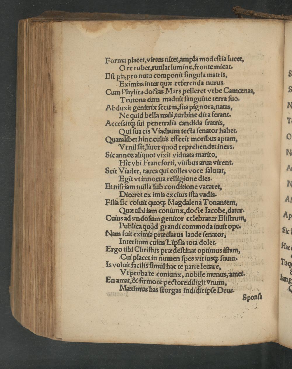 Eſt pia,pro nutu componit ſingula matris, 8 Eximias inter quæ referenda nurus. Cum Phylira doctas Mars pelleret vrbe Camcœnars, 8 Teutona cum maduit ſanguine terra ſuo. Abduxit genitrix ſecum, ſua pignora, natas, 8 Ne quid bella mali, turbine dira ferant. 3 b Acceſsitq́; ſui penetralia candida fratris, T. Qui ſua eis Viadrum tecta ſenator habet. b Quamlibet hinc cultis effecit moribus aptam, 0 Vt nil ſit, liuor quod reprehendet iners. Sic annos aliquot vixit viduata marito, N Hic vbi Francforti, vitibus arua virent. 3 Scit Viader, rauca qui colles voce ſalutat, A Egit vt innocua relligione dies. W Et niſt iam nulla ſub conditione vacaret, 5 Dicceret ex imis excitus iſta vadis. Filia ſic coluit quoq; Magdalena Tonantem, 4¹ Quæ tibi iam coniunx, docte Iacobe, datur. 3 Cuius ad vndoſum genitor celebratur Eliſtrum, P Publica quòd grandi commoda iuuit ope. 84 Nam fuit eximia præclarus laude ſenateof“, ie Interitum cuius Lipſia tota dolert. H. Ergo tibi Chriſtus prædeſtinat optimus iſtaum, c Cui placet in numen ſpes vtriusq; ſuum. p Is voluit facilis ſimul hac te parte leuar²e,“ ug