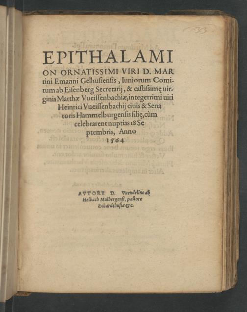 tini Emanni Gelhuſienſis, Iuniorum Comi- tum ab Eiſenberg Secretarij,& caſtiſsime uir- ginis Marthæ Vu eiſſenbachiæ,integerrimi uiri Heinrici Vueiſſenbachij ciuis& Sena toris Hammelburgenſis sfilie cùm celebrarent nuptias ¹s Se ptembris, Anno 1564