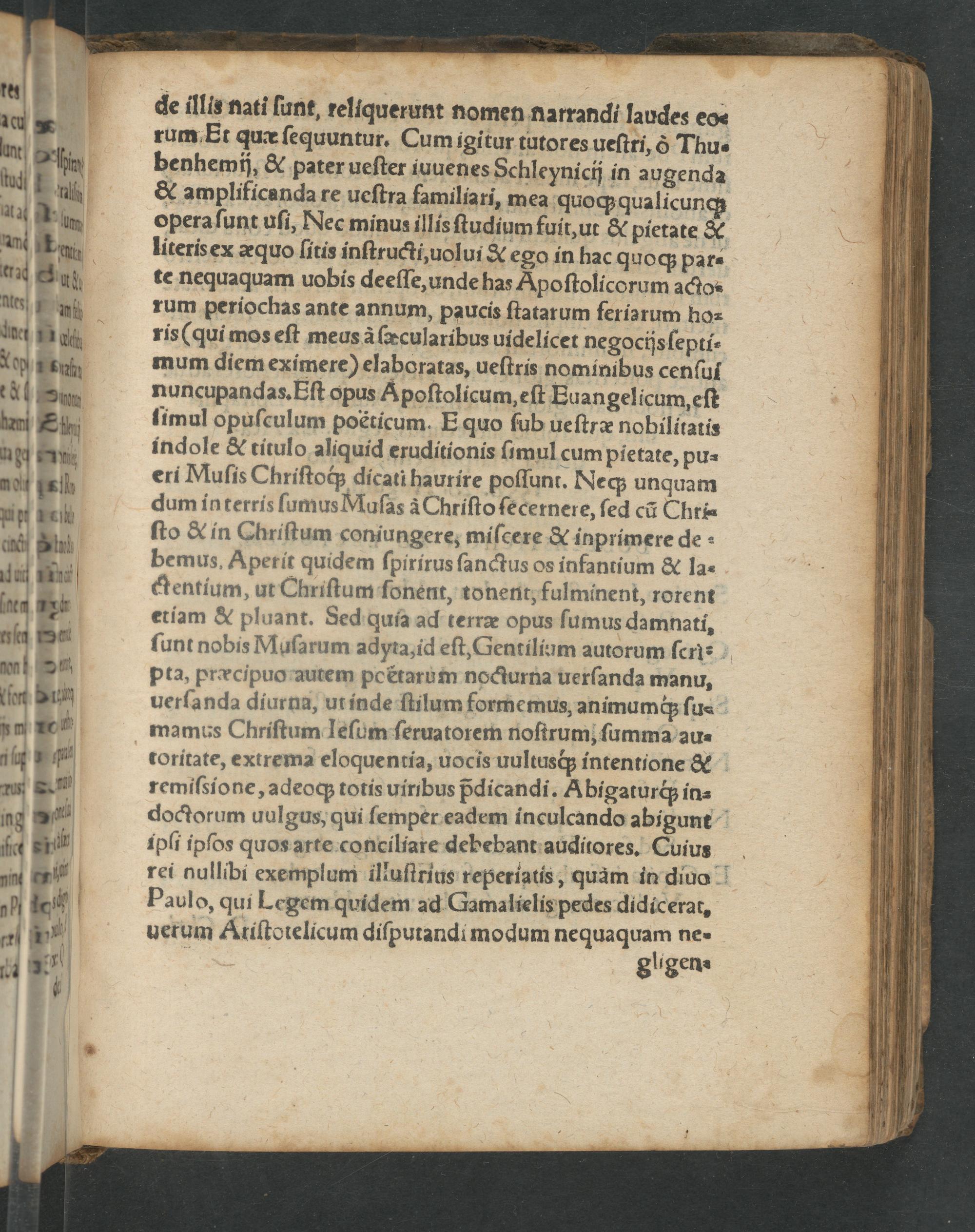 de illis nati ſunt, reliquerunt nomen narrandi laudes eo⸗ rum Et quæ ſequuntur. Cum igitur tutores ueſtri, 6 Thu⸗ benhemij,& pater ueſter iuuenes Schleynicij in augenda & amplificanda re ueſtra familiari, mea quoq; qualicunq; opera ſunt uſi, Nec minus illis ſtudium fuit, ut& pietate& literis ex æquo ſitis inſtructi, uolui& ego in hac q uoq; par⸗ te nequaquam uobis deeſſe, unde has Apoſtolicorum acto⸗ rum periochas ante annum, paucis ſtatarum feriarum ho⸗ ris(qui mos eſt meus à ſæcularibus uidelicet negocijs ſepti⸗ mum diem eximere) elaboratas, ueſtris nominibus cenſui nuncupandas. Eſt opus Apoſtolicum, eſt Buangelicum, eſt ſimul opuſculum poẽticum. E quo ſub ueſtræ nobilitatis indole& titulo aliquid eruditionis ſimul cum pietate, pu- eri Muſis Chriſtoq́; dicati haurire poſſunt. Neq; unquam dum interris ſumus Muſas à Chriſto ſecernere, ſed cũ Chri- ſto& in Chriſtum coniungere, miſcere& inprimere de⸗ bemus. Aperit quidem ſpirirus ſanctus os infantium& la⸗ ctentium, ut Chriſtum ſonent, tonent, fulminent, rorent etiam& pluant. Sed quia ad terræ opus ſumus damnati, ſunt nobis Muſarum adyta, id eſt, Gentilium autorum ſen⸗ pPta, præcipuo autem pottarum nocturna uerſanda manu, uerſanda diurna, ut inde ſtilum formemus, animumq́; ſu- mamus Chriſtum Ieſum ſeruatorem noſtrum, ſumma au- toritate, extrema eloquentia, uocis uultusq́; intentione& remiſsione, adeoq; totis uirbus P̃dicandi. Abigaturq́; in- doctorum uulgus, qui ſemper eadem inculcando abigunt ipli ipſos quos arte conciliare debebant auditores. Cuius rei nullibi exemplum illuſtrius reperiatis, quam in diuo Paulo, qui Legem quidem ad Gamalielis pedes didicerat, uerum Ariſtotelicum diſputandi modum nequaquam ne- gligen⸗