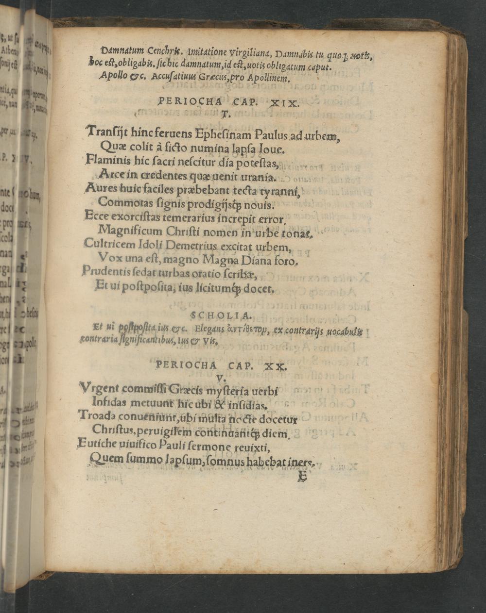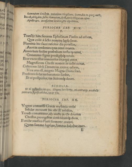 PERIOCHA Tranſijt hine feruens Epheſinam Paulus ad urbem, Qux colit à ficto numina lapſa Ioue. Flaminis hic ſacri neſcitur dia poteſtas, Arce in credentes quæ uenit urania. Aures huie faciles præbebant tecta tyranni, Commotas ſignis prodigijsi nouis. b Ecce exorciſtas temerarius increpit error. Magnificum Chriſti nomen in urbe tonat. Cultricem Idoli Demetrius excitat urbem, Vox una eſt, magno Magna Diana foro. Prudentis ſedat turbas oratio ſceribæ, Et ui poſtpoſita, ius licitumq́; docet.
