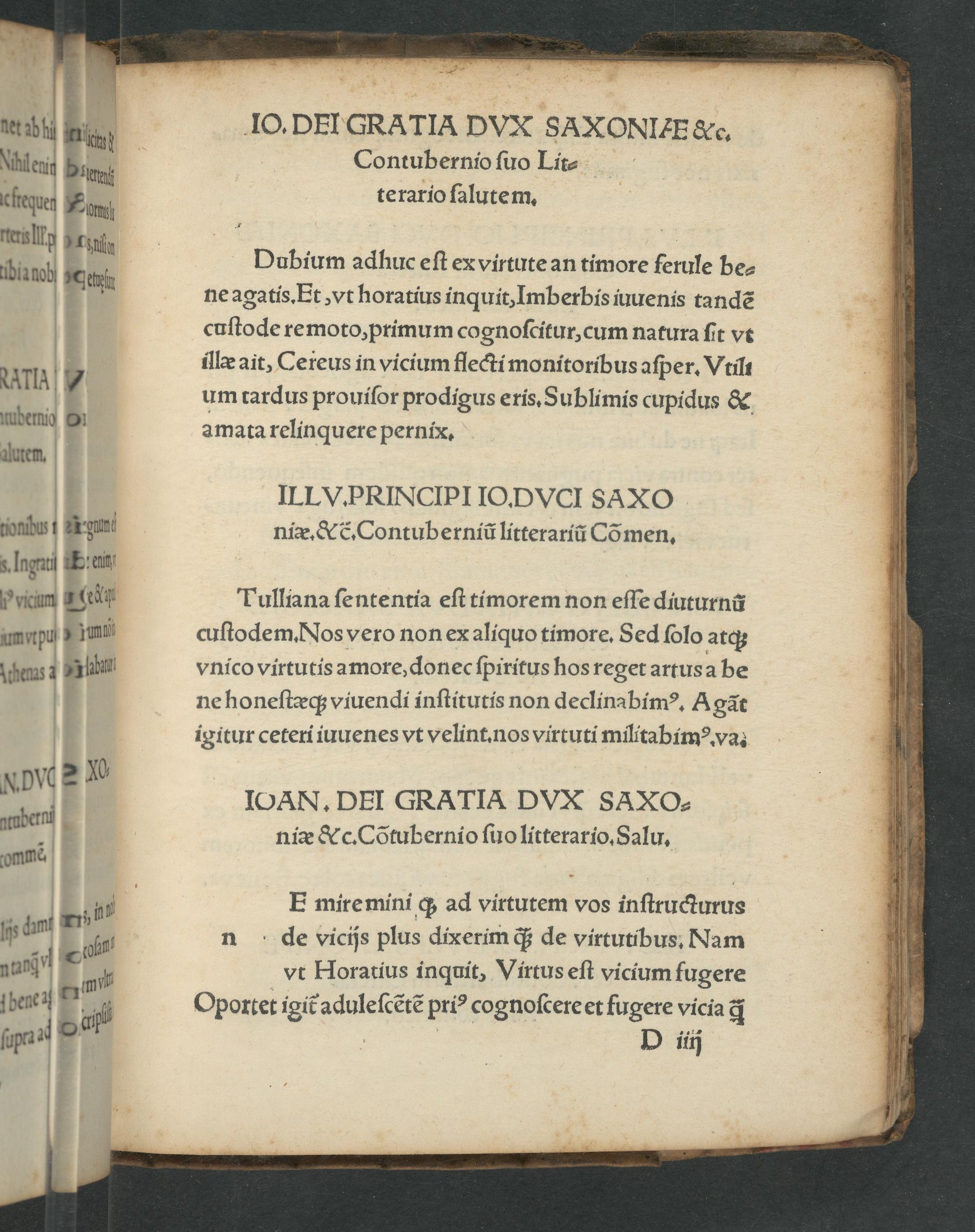 d 4 2 um tardus prouiſor prodigus eris. Sublimis cupidus& ſ 2 amata relinquere pernix. autem. 1 IILV.PRINCIPIIODVCI SAXNO tonidos ar gun niæ.&&. Contub erniũ litterariũ Cõmen, lngi i enn Pricum 1 eä Tulliana ſententia eſt timorem non eſſe diuturnũ um tpuj„ Im cuſtodem. Nos vero non ex aliquo timore. Sed ſolo atqʒ zühenns 1„Kabab vnico virtutis amore, donec ſpiritus hos reget artus a be 1 ne honeſtæq; viuendi inſtitutis non declinabimꝰ. Agãt 1 igitur ceteri iuuenes vt velint.nos virtuti militabimꝰ. va. M XbW 9 1 IOAN. DEI GRATIA DVX SAXO⸗ ubec niæ& c. Cõtubernio ſuo litterario. Salu. vomme.