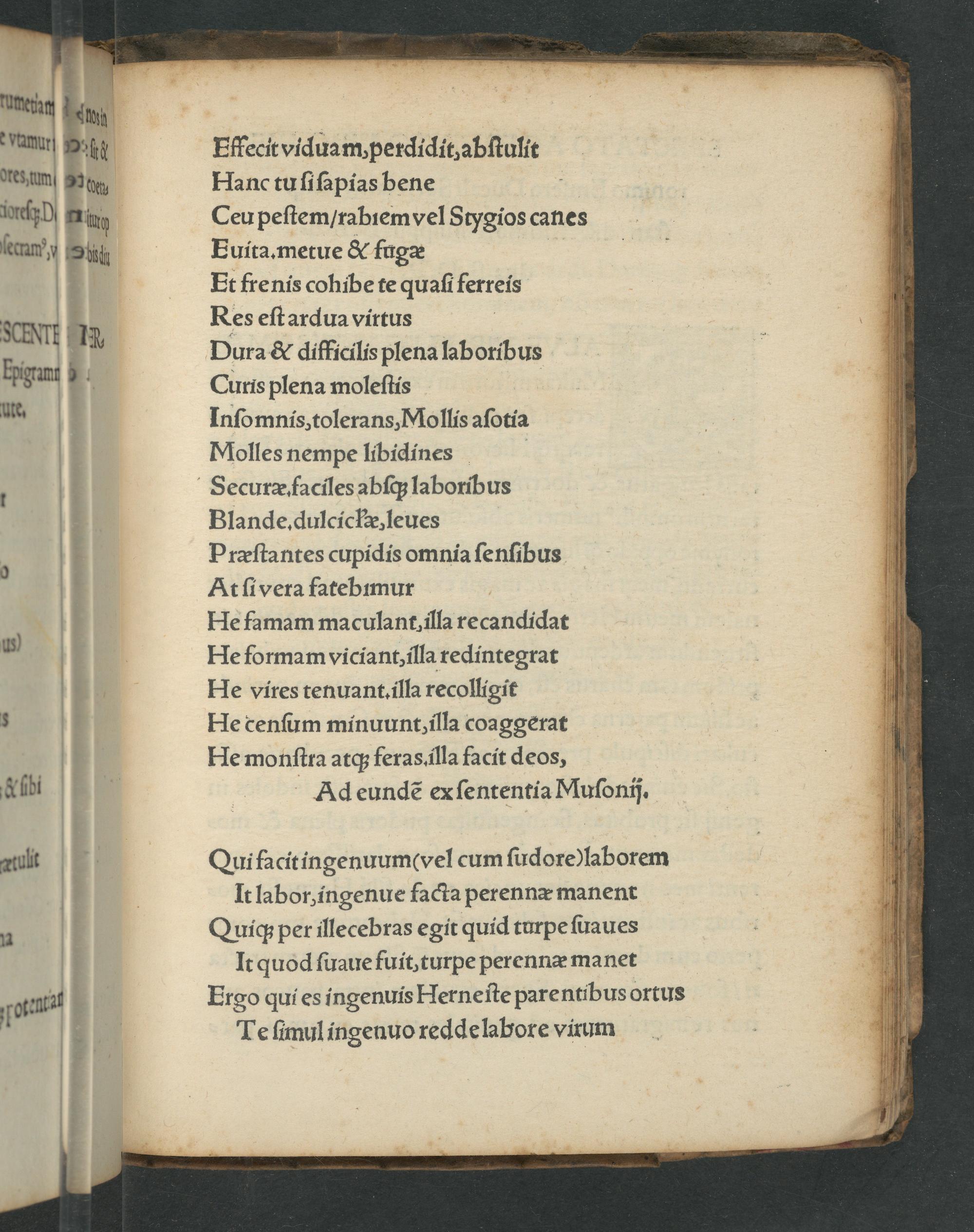 Qui facit ingenuum(vel cum ſidore)laborem It labor, ingenue facta perennæ manent Quicʒ per illecebras egit quid turpe ſuaues It quod ſuaue fuit, turpe perennæ manet Ergo qui es ingenuis Herneite parentibus ortus Te ſimul ingenuo redde labore virum