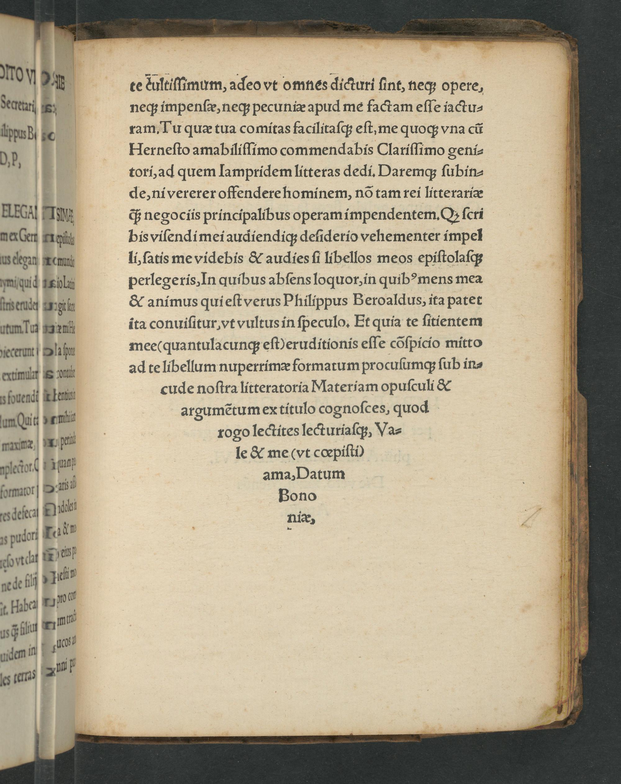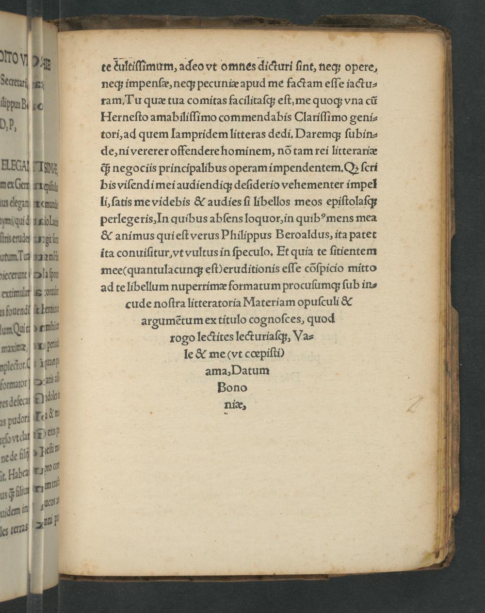 te dultiſſimum, adeo vt omnes dicturi ſint, neq; opere, neq; impenſæ, neq; pecuniæ apud me factam eſſe iactu⸗ ram. Tu quæ tua comitas facilitaſq́; eſt, me quoq; vna cũ Herneſto amabiliſſimo commendabis Clariſſimo geni⸗ tori, ad quem Jampridem litteras dedi. Daremq; ſubin⸗ de, ni vererer offendere hominem, nõ tam rei litterariæ q́; negociis principalibus operam impendentem. Q ſcri bis viſendi mei audiendiqʒ deſiderio vehementer impel li, ſatis me videbis& audies ſi libellos meos epiſtolaſq; perlegeris, In quibus abſens loquor, in quibꝰmens mea & animus quieſtverus Philippus Beroaldus, ita patet ita conuiſitur, vt vultus in ſpeculo. Et quia te ſitientem mee(quantulacunq; eſt)eruditionis eſſe cõſpicio mitto ad te libellum nuperrimæ formatum procuſumq; ſub in⸗ cude noſtra litteratoria Materiam opuſculi& argumẽtum ex titulo cognoſces, quod rogo lectites lecturiaſq;, Va⸗ le& me(vt cœpiſti) ama, Datum Bono niiæ,