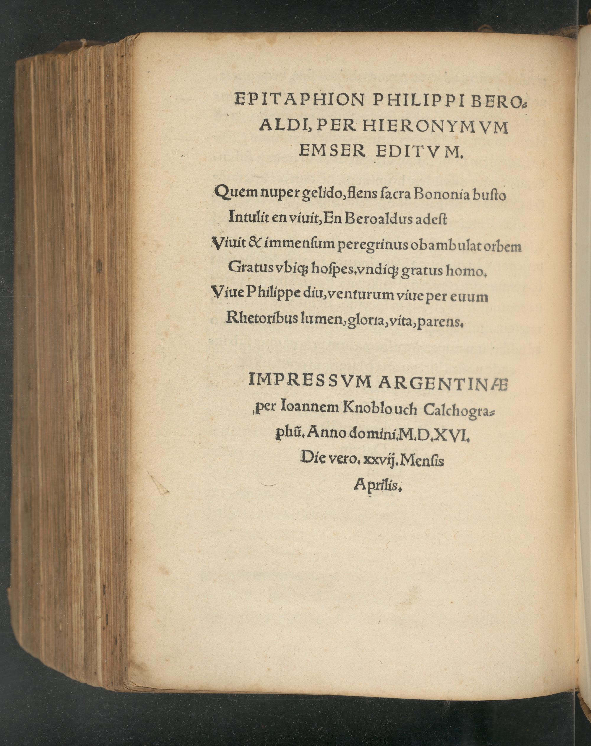 Quem nuper gelido, flens ſacra Bononia buſto Intulit en viuit, En Beroaldus adeſt Viuit& immenſum peregrinus obambulat orbem Gratus vbiq;ʒ hoſpes. vndiq; gratus homo. Viue Philippe diu, venturum viue per euum