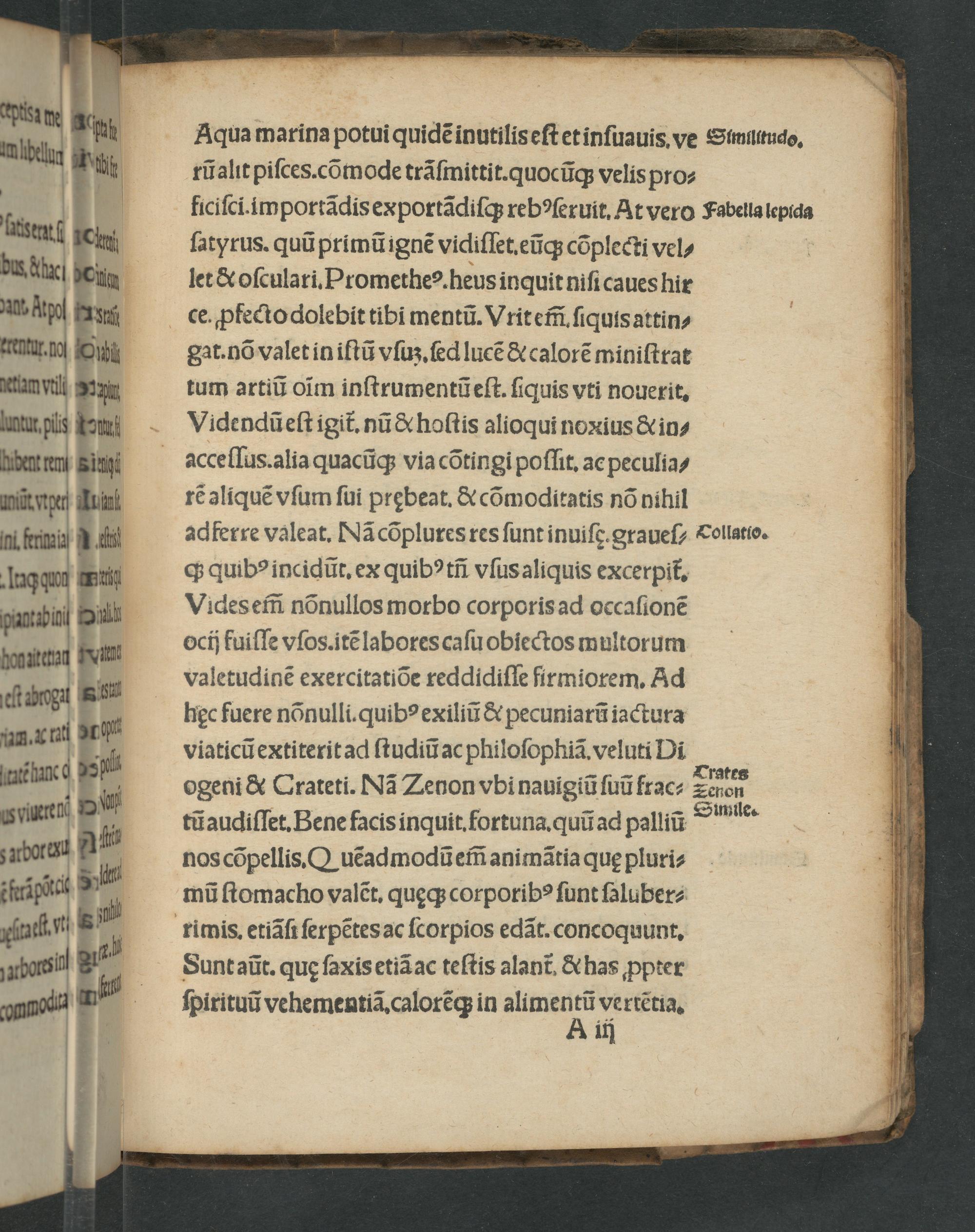 Aqua marina potui quidẽ inutilis eſt et inſuauis. ve Simuſtudo. rũalit piſces.cõmode trãſmittit. quocũq; velis pro⸗ ficiſci importãdis exportãdiſq; rebꝰſeruit. At vero Fabella lepida ſatyrus. quũ primũ ignẽ vidiſſet. eũq; cõplecti vel/ let& oſculari. Promethes. heus inquit niſi caues hir ce. ꝓfecto dolebit tibi mentũ. Vrit em̃. ſiquis attin- gat.nõ valet in iftũ vſuʒ.ſed lucẽ& calorẽ miniſtrat tum artiũ oĩm inſtrumentũ eſt. ſiquis vti nouerit. Videndũ eſt igit᷑.nũ& hoſtis alioqui noxius& in/ acce ſſus. alia quacũq; via cõtingi poſſit. ac peculia⸗ rẽ aliquẽ vſum ſui prębeat.& cõmoditatis nõ nihil adferre valeat. Nã cõplures res ſunt inuiſg. graueſ⸗ Tollatio. qꝙ; quibꝰ incidũt. ex quibꝰtñ vſus aliquis excerpit᷑. Vides em̃ nõnullos morbo corporis ad occaſionẽ ocij fuiſſe vſos.itẽ labores caſu obiectos multorum valetudinẽ exercitatiõe reddidiſſe firmiorem. Ad hec fuere nõnulli.quibꝰ exiliũ& pecuniarũ iactura viaticũ extiterit ad ſtudiũ ac philoſophiã. veluti Diĩ ogeni& Crateti. Nã Zenon vbi nauigiũ ſuũ frac⸗ Saree tũ audiſſet. Bene facis inquit. fortuna. quũ ad palliũ S ſls. nos cõpellis. Quẽadmodũ em̃ ani mãtia quę pluri⸗ mũ ſtomacho valẽt. quęq; corporibꝰ ſunt ſaluber⸗