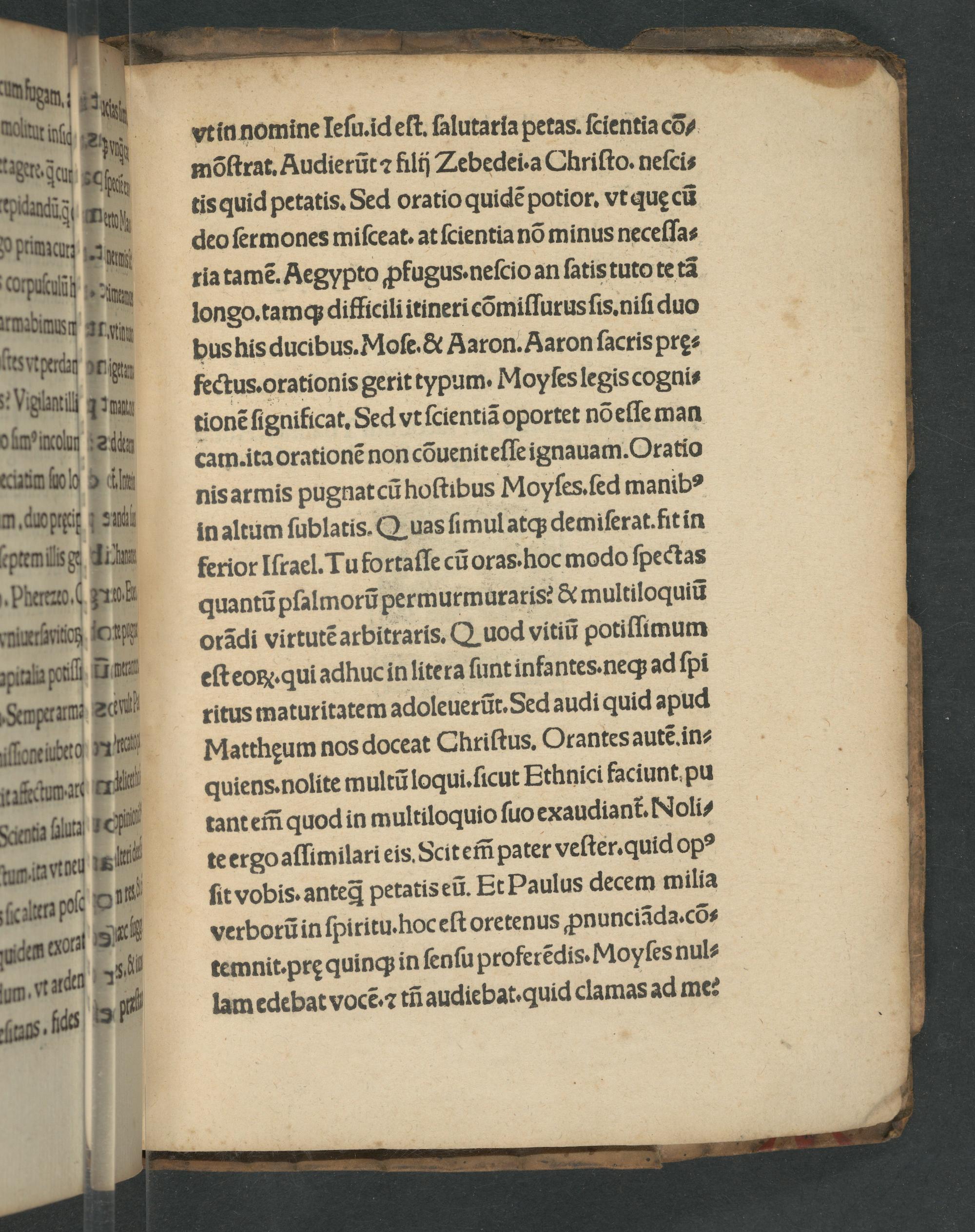 vtin nomine leſu.id eſt. ſalutaria petas. ſcientia cõ⸗ mõſtrat. Audierũt ⁊ filij Zebedei. a Chriſto. neſci⸗ tis quid petatis. Sed oratio quidẽ potior. vt quę cũ deo ſermones miſceat.at ſcientia nõ minus neceſſa⸗ ria tamẽ. Aegypto ꝓfugus.neſcio an atis tuto te tã longo. tamq; difficili itineri cõmiſſurusſis. niſi duo bushis ducibus. Moſe.& Aaron. Aaron acris prę⸗ fectus. orationis gerit typum. Moyſes legis cogni⸗ tionẽ ſignificat. Sed vt ſcientiã oportet nõeſſe man cam. ita orationẽ non cõueniteſſe ignauam. Oratio nis armis pugnat cũ hoſtibus Moyſes. ſed manib in altum ſublatis. Quas ſimul atq; demiſerat.fit in ferior Iſrael. Tu fortaſſe cũ oras. hoc modo ſpectas quantũ pſalmorũ permurmuraris?& multiloquiũ otãdi virtutẽ arbitraris. Quod vitiũ potiſſimum eſteoꝶ.ꝗqui adhuc in litera ſunt infantes.neq; ad ſpi ritus maturitatem adoleuerũt. Sed audi quid apud Matthęum nos doceat Chriſtus. Orantes autẽ. in⸗ quiens. nolite multũ loqui. ſicut Ethnici faciunt pu tant eñ̃ quod in multiloquio ſuo exaudiant. Noli⸗ te ergo aſſimilari eis. Scit em̃ pater veſter.quid opꝰ ſit vobis.·anteꝗᷓ petatis eũ. Et Paulus decem milia verborũ in ſpiritu.hoc eſt oretenus ꝓnunciãda.cõ⸗ temnit. prę quinq; in ſenſu proferẽdis. Moyſes nul⸗ lam edebat vocẽ:⁊ tñ audiebat. quid clamas ad me: