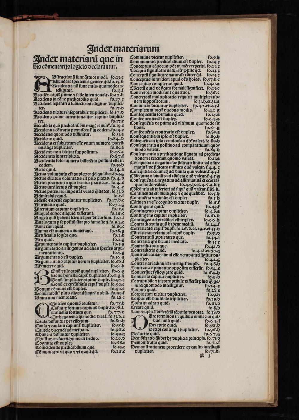 Cum/ duplicẽ differẽtiã tẽpoꝛis denotat. fo.ʒ8.d Are terminos in quibus omni ⁊ in qui/ bus nulli quid. fo.6 4.t Deceptio quid. fo.9OG.h Decipi contingit dupliciter., fo.96.h Deductio quid. fo.6 7. g Demõſtratio q̃libet hʒ duplicia pꝛincipia.fo.7i.b Demonſtratio quid. fo. 70. f Demonſtrationem pꝛocedere ex cauſis intelligit᷑ pupliciter. fo. 71¹*d.