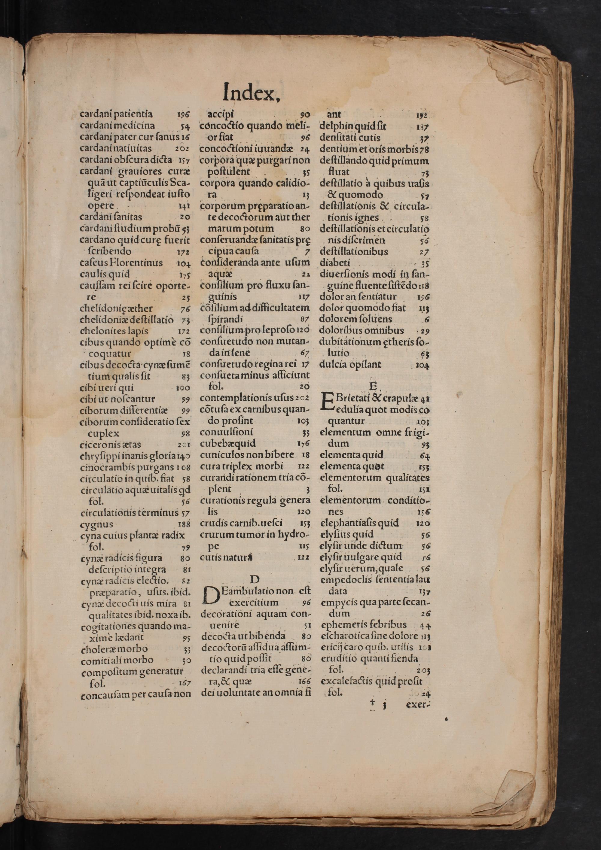 quantur 103 elementum omne frigi- dum 93 elementa quid 64 elementa quot 15z elementorum qualitates fol. 151 elementorum conditio- nes 156 elephantiaſis quid 120 elyſius quid 56