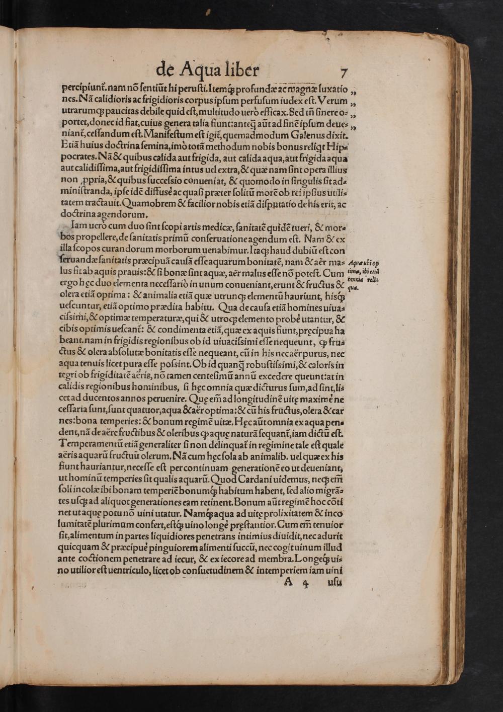 de Aqua liber 7 Percipiunt᷑.nam nõ ſentiũt hi peruſti.ltemq;ʒ profundæ ac magnæ luxatio„ nes. Nã calidioris ac frigidioris corpus ipſum perfuſum iudex eſt Verum„ utrarumq; paucitas debile quid eſt, multitudo uerò efficax. Sed tñ ſinere o⸗, portet, donecid fiat, cuius genera talia fiunt: anteꝗᷓ aũt ad finẽ ipſum deue⸗, nianð᷑ ceſſandum eſt. Manifeſtum eſt igit᷑, quemadmodum Galenus dixit. Etiã huius doctrina ſemina, imò totã methodum nobis bonusreliꝗt Hip⸗ pocrates. Nã& quibus calida aut frigida, aut calida aqua, aut frigida aqua aut calidiſſima, aut frigidiſſima intus uel extra,& quæ nam ſint opera illius non ꝓpria,& quibus ſucceſsio conueniat,& quomodo in ſingulis ſitad⸗ miniſtranda, ipſe idẽ diffusè ac quaſi præter ſolitũ morẽ ob rei ipſius utili⸗ tatem tractauit. Quamobrem& facilior nobis etiã diſputatio dehis erit, ac doctrina agendorum. Iam uerò cum duo ſint ſcopi artis medicæ, ſanitatè quidẽ tueri,& mor- bos propellere, de ſanitatis primũ conſeruatione agendum eſt. Nam& ex illa ſcopos curandorum morborum uenabimur. Icaq; haud dubiũ eſtcon ſeruandæ ſanitatis præcipuã cauſã eſſeaquarum bonitatẽ, nam& aèr ma⸗ Ahuæubĩop lus fit ab aquis prauis:& ſt bonæ ſint aquæ, aer malus eſſe nõ poteſt. Cum ane Lee ergo hęc duo elementa neceſſariò in unum conueniant, erunt& fructus& zua. 7 olera etiã optima:& animalia etiã quæ utrunq; elementũ hauriunt, hisq́; ueſcuntur, etiã optimo prædita habitu. Qua de cauſa etiã homines uiua⸗ ciſsimi,& optimæ temperaturæ, qui& utroq; elemento probè utantur,& cibis optimis ueſcant:& condimenta etiã, quæ ex aquis fiunt, pręcipua ha beant᷑. nam in frigidis regionibus ob id uiuaciſsimi eſſe nequeunt, ꝙ fru⸗ ctus& olera abſolutæ bonitatis eſſe nequeant, cũ in his necaẽr purus, nec aqua tenuis licet pura eſſe poſsint. Ob id quanꝗᷓ robuſtiſsimi,& caloris in tegri ob frigiditatẽ acris, nõ tamen centeſimũ annũ excedere queunttat in calidis regionibus hominibus, ſi hęcomnia quæ dicturus ſum, ad ſint, li⸗ cet ad ducentos annos peruenire. Quę em̃ ad longitudinẽ uitę maximè ne ceſſaria ſunt, ſunt quatuor, aqua& aer optima:& cũ his fructus, olera&car nes:bona temperies:& bonum regimẽ uitæ, Hęc aũtomnia exaqua pen- dent᷑ nã deaere fructibus& oleribus ꝙ aquę naturã ſequanĩ᷑, iam dictũ eſt. Temperamentũ etiã generaliter ſi non delinquat᷑ in regimine tale eſt quale acris aquarũ fructuũ olerum. Nã cum hęcſola ab animalib. uelquæ ex his fiunt hauriantur, neceſſe eſt percontinuam generationẽ eo ut deueniant, ut hominũ temperies ſit qualis aquarũ. Quod Cardani uidemus, neq; em̃ ſoli incolæibi bonam temperiẽ bonumꝗ́; habitum habent, ſed alio migrã⸗ tes uſq; ad aliquot generationes eam retinent. Bonum aũtregimẽ hoc cõti net ut aquę potu nõ uini utatur. Namq́; aqua ad uitę prolixitatem& inco lumitatẽ plurimum confert, eſtq́; uino longè pręſtantior. Qum em̃ tenuior ſit, alimentum in partes liquidiores penetrans intimius diuidit, nec adurit quicquam& præcipuè pinguiorem alimenti ſuccũ, nec cogit uinum illud ante coctionem penetrare ad iecur,& ex iecore ad membra. Longeq́ʒ ui⸗ no utilior eſt uentriculo, licet ob conſuetudinem& intemperiem iam uini A 4 uſu