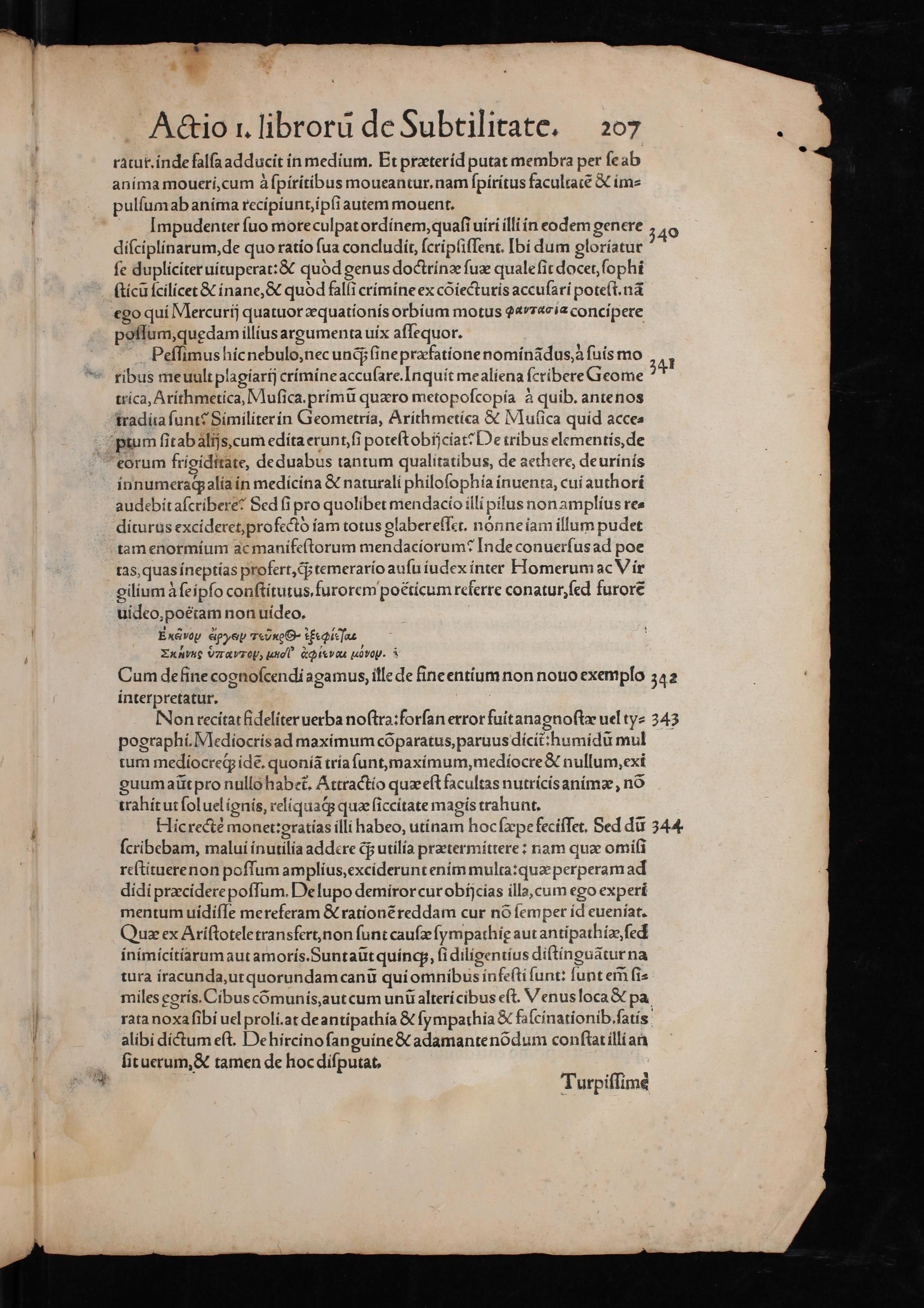 Hicrectè monet:gratias illi habeo, utinam hoc ſæpe feciſſet. Sed dũ 344 ſcribebam, malui inutilia addere qᷓ; utilia prætermittere: nam quæ omiſi reſtituere non poſſum amplius, exciderunt enim multa: quæ perperam ad didi præcidere poſſum. De lupo demiror cur obijcias illa, cum ego experi mentum uidiſſe me referam& rationẽ reddam cur nõ ſemper id eueniat. Quxæ ex Ariſtotele transfert, non ſunt cauſæ ſympathię aut antipathiæ, ſed inimicitiarum aut amoris. Sunt aũt quincqʒ, ſi diligentius diſtinguãtur na tura iracunda, ut quorundam canũ qui omnibus infeſti ſunt: ſunt em̃ ſi⸗ miles ęgris. Cibus cõmunis, aut cum unũ alteri cibus eſt. Venus loca& pa rata noxa ſibi uel proli. at de antipathia& ſympathia& faſcinationib. ſatis alibi dictum eſt. De hircino ſanguine& adamante nõdum conſtat illi an ſit uerum,& tamen de hoc diſputat.
